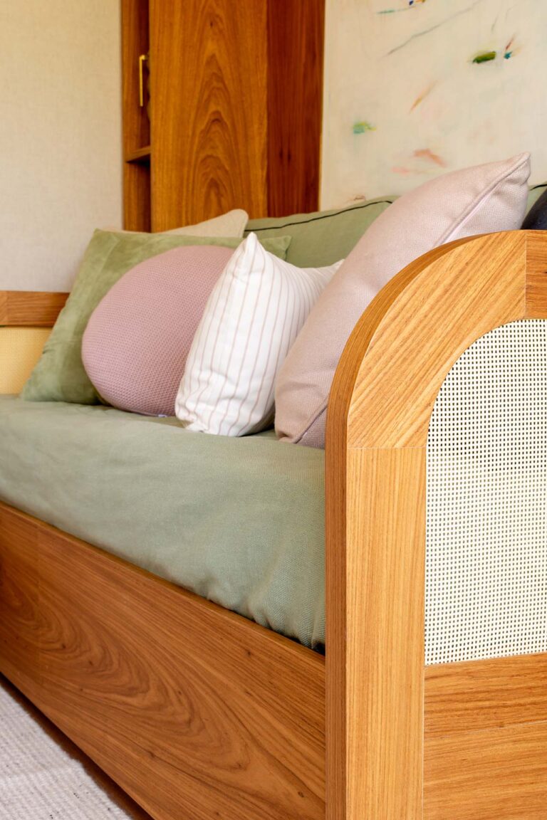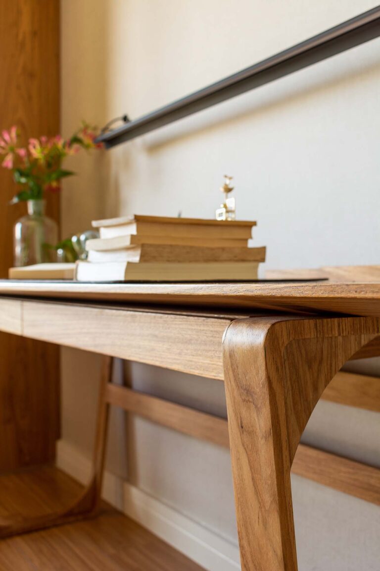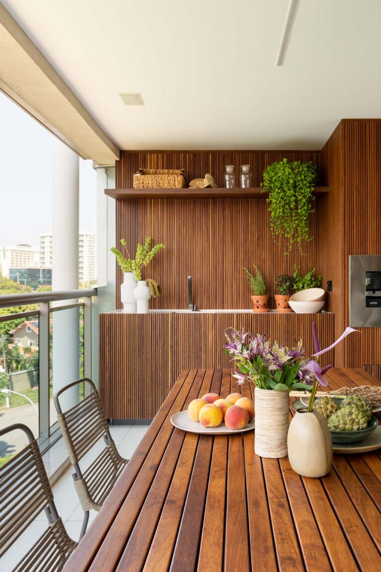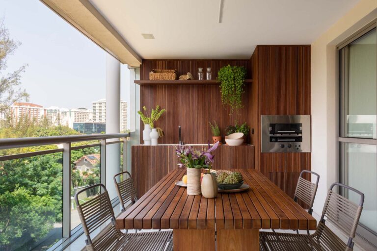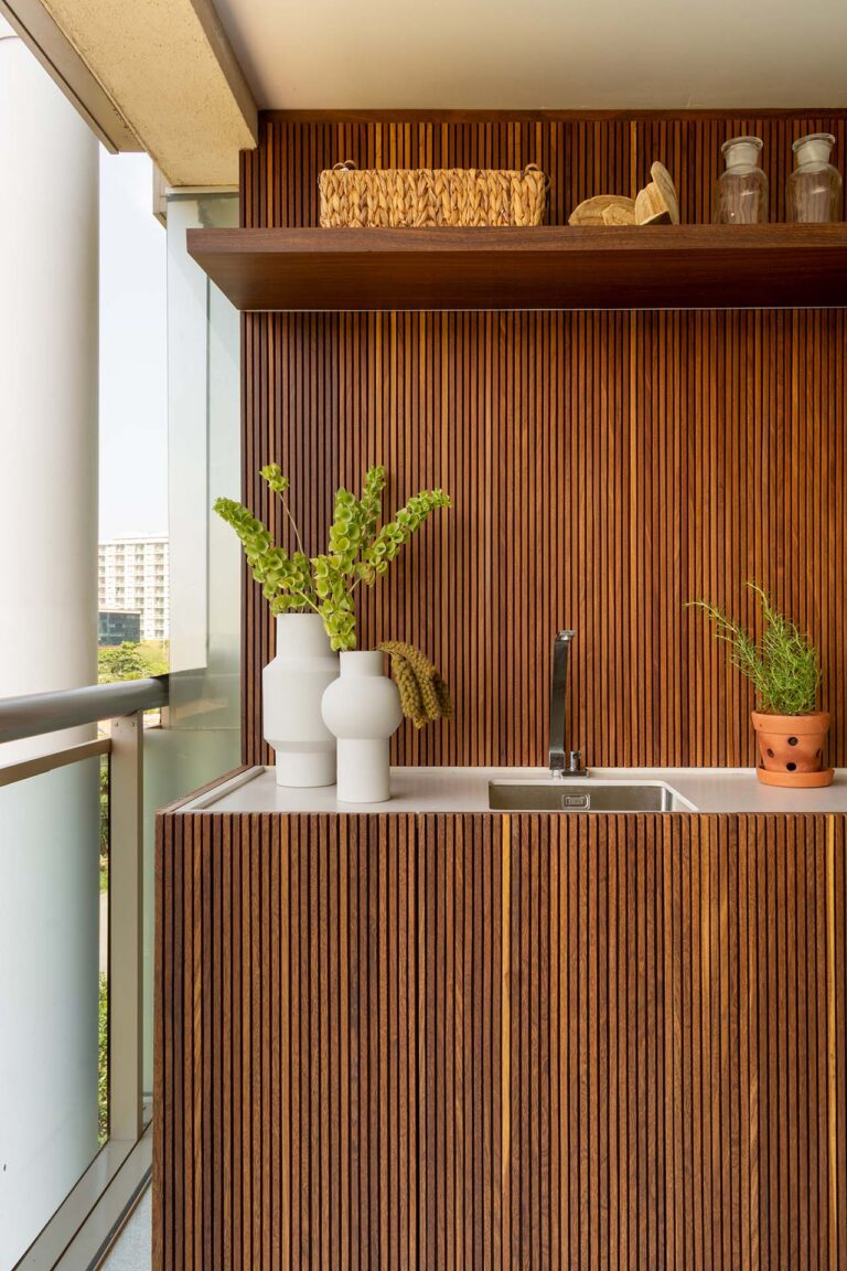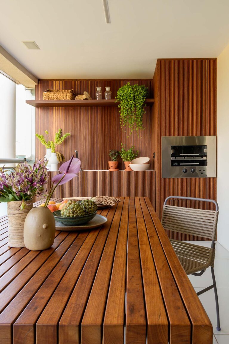 A setorização foi planejada para garantir dinamismo e conforto: em uma extremidade, a área de estar convida ao relaxamento; no centro, a mesa de jantar articula o convívio; e, na ponta oposta, concentra-se a área técnica com a churrasqueira e bancada. A solução de marcenaria em madeira cumaru é o grande destaque, utilizando um ripado 1×1 que camufla com maestria armários, paredes e a própria estrutura da churrasqueira, conferindo uma perspectiva limpa e contínua. Para garantir a longevidade, visto que a varanda é aberta, foram aplicados materiais de alta performance, como a bancada em ultracompact e tecidos hidrorrepelentes em almofadas e tapetes, unindo durabilidade à estética apurada.