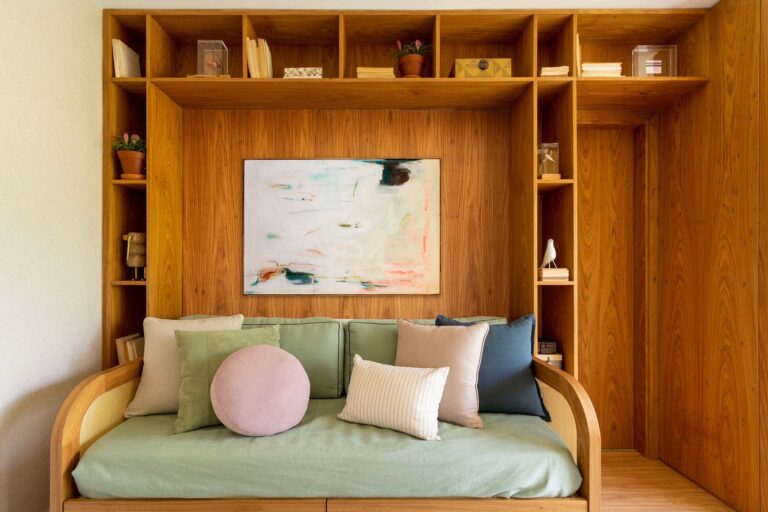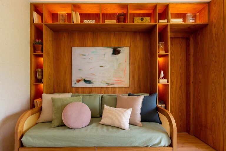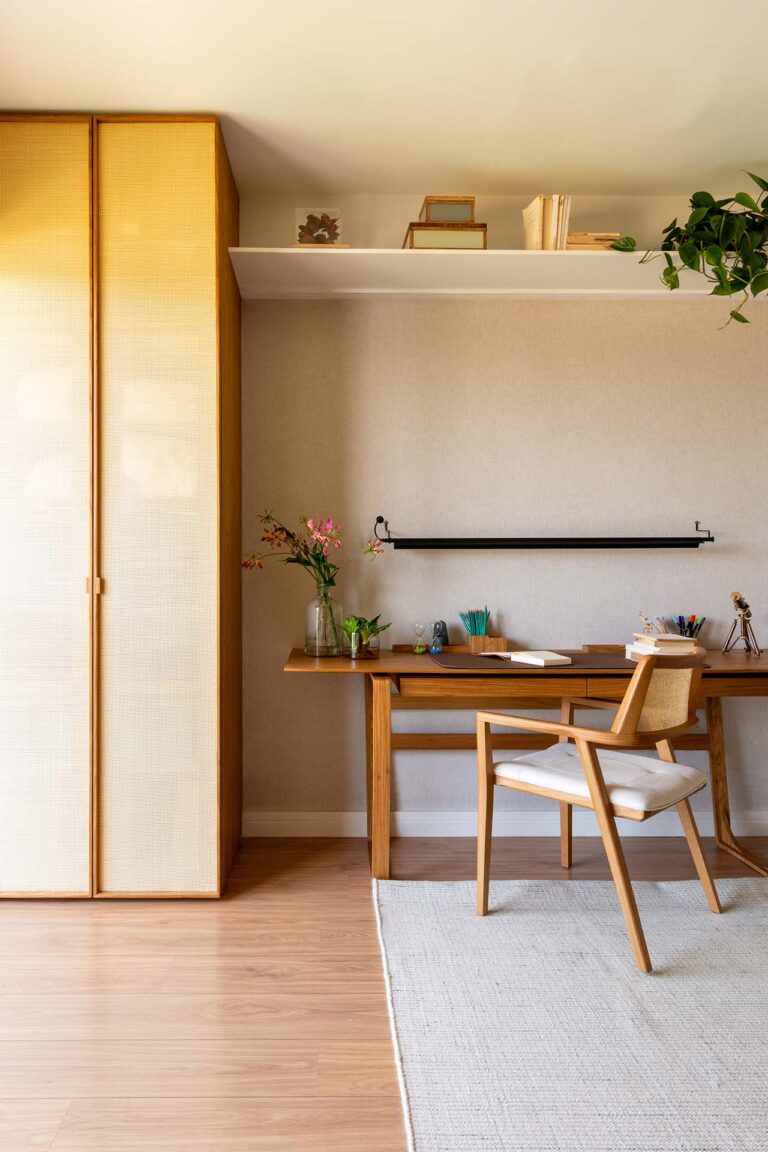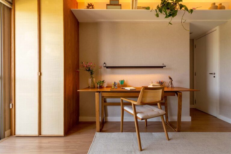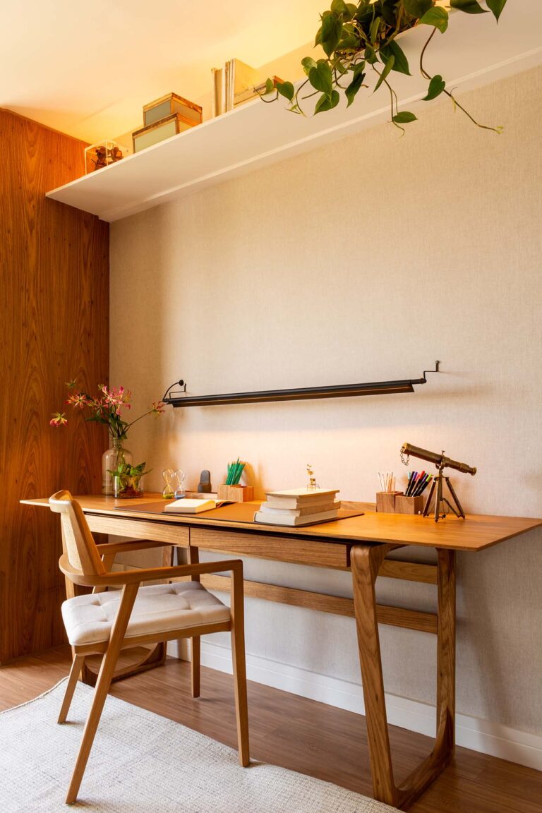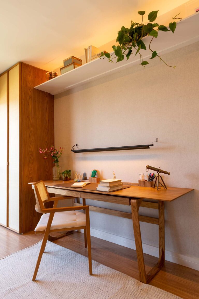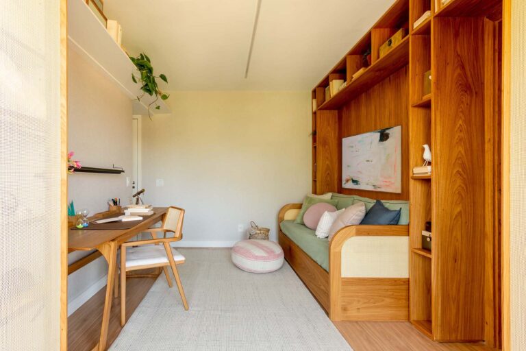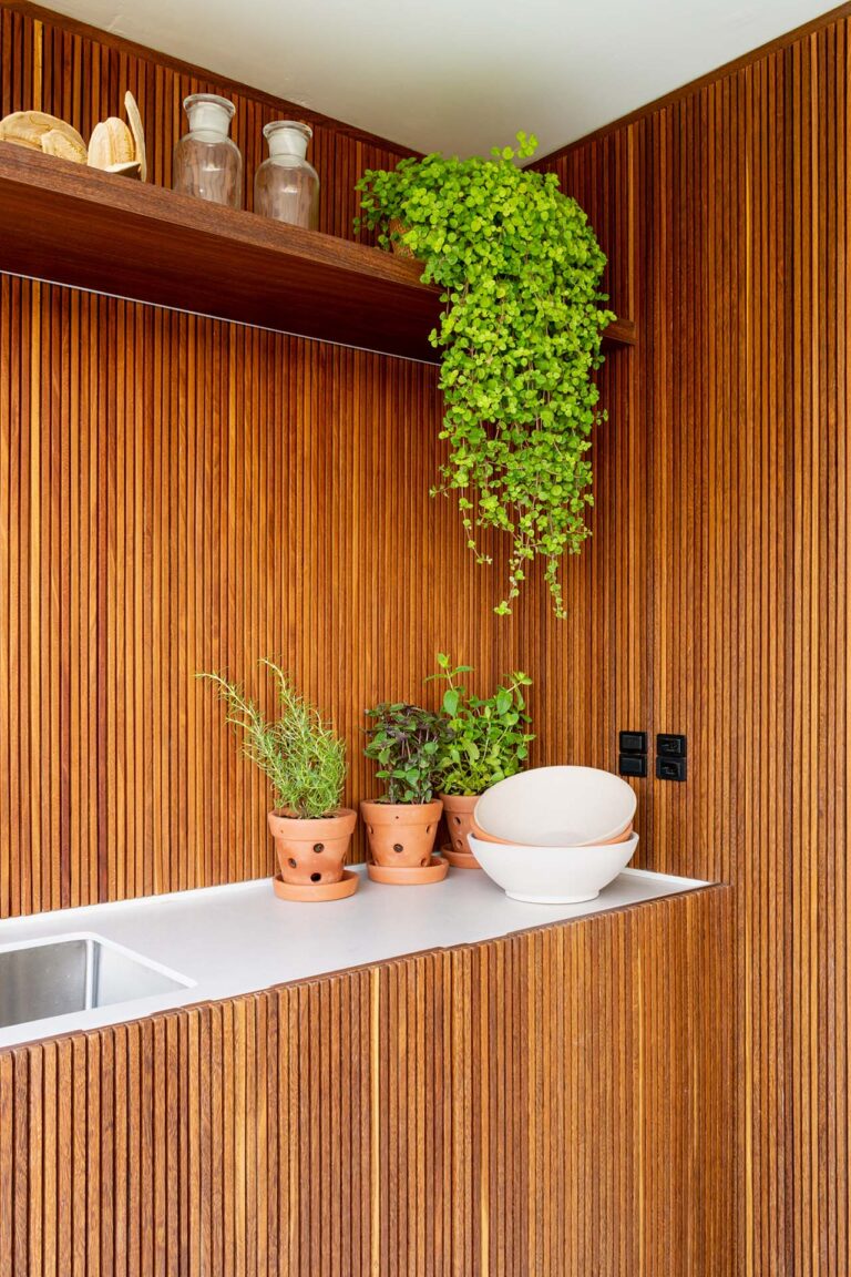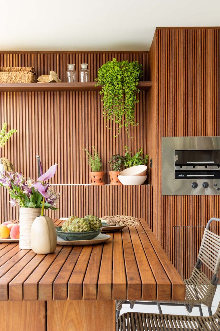 A atmosfera do projeto é definida pelo equilíbrio entre o rústico da madeira e a modernidade dos acabamentos tecnológicos, evocando o frescor contemporâneo característico do Estúdio Popa. O uso da madeira cumaru, em sintonia com a iluminação pontual e a curadoria de adornos, cria um cenário onde a robustez necessária para as intempéries não compromete a leveza visual. Cada detalhe, desde o detalhe do armário que esconde a espessura da bancada até a escolha do pufe verde e do paisagismo, foi pensado para provocar uma sensação de refúgio urbano, transformando a varanda em um lugar significativo para a convivência familiar.