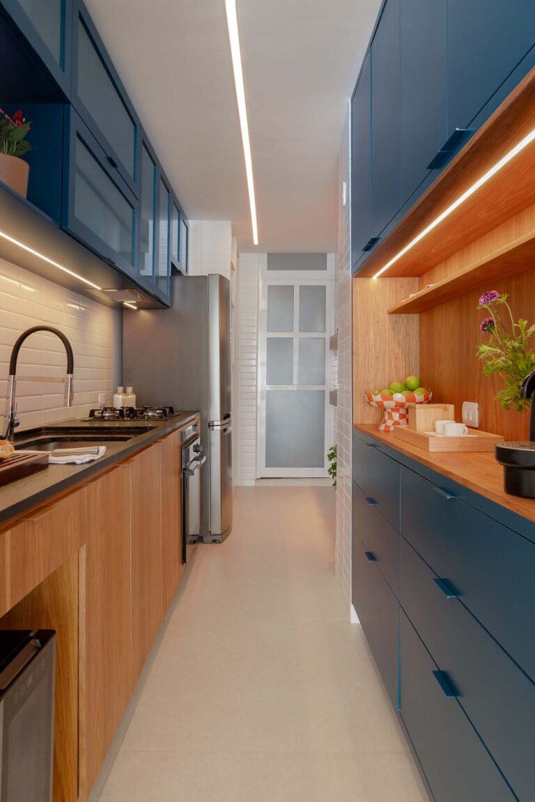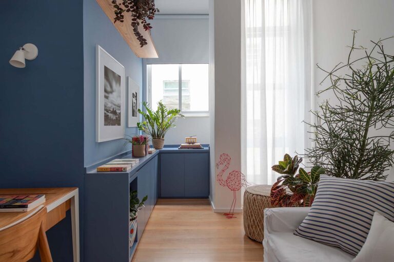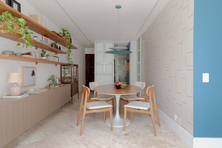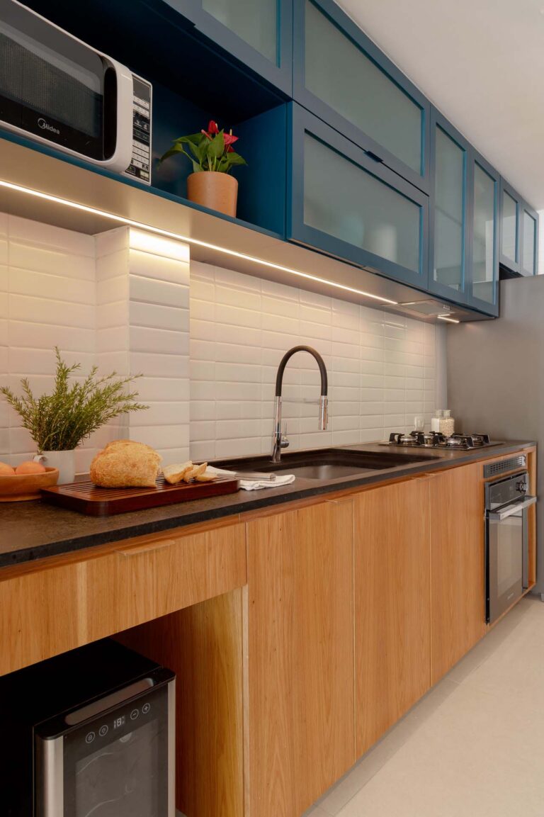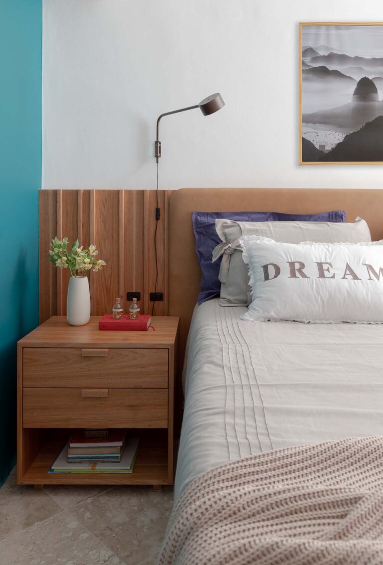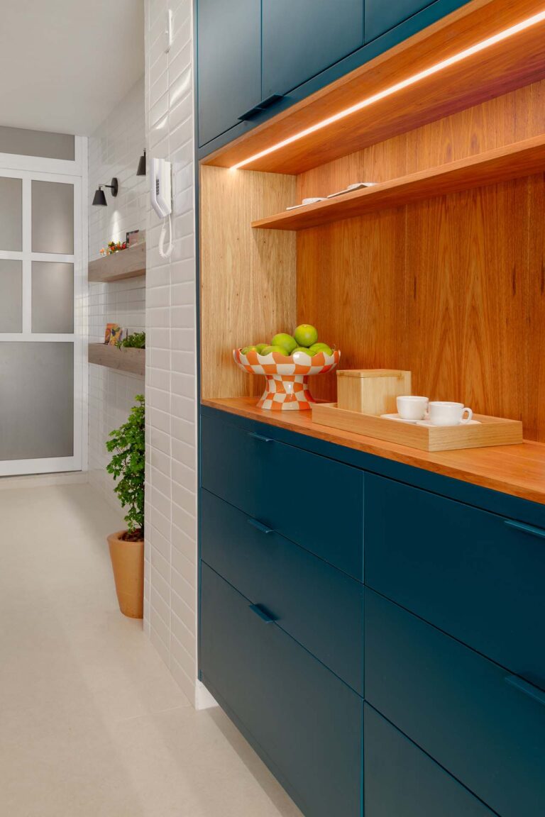 Na área social, o delicado painel de azulejos dialoga com a parede em azul profundo e o pufe terroso. A madeira atua como ponto de aconchego, presente nas prateleiras lineares, na marcenaria da cozinha e na marcante cabeceira ripada da suíte.