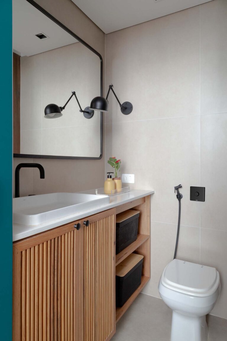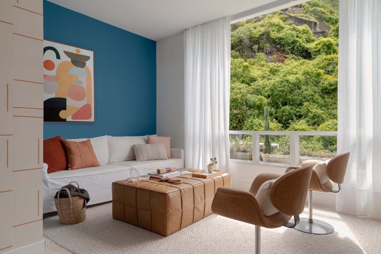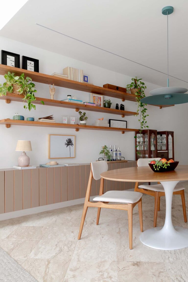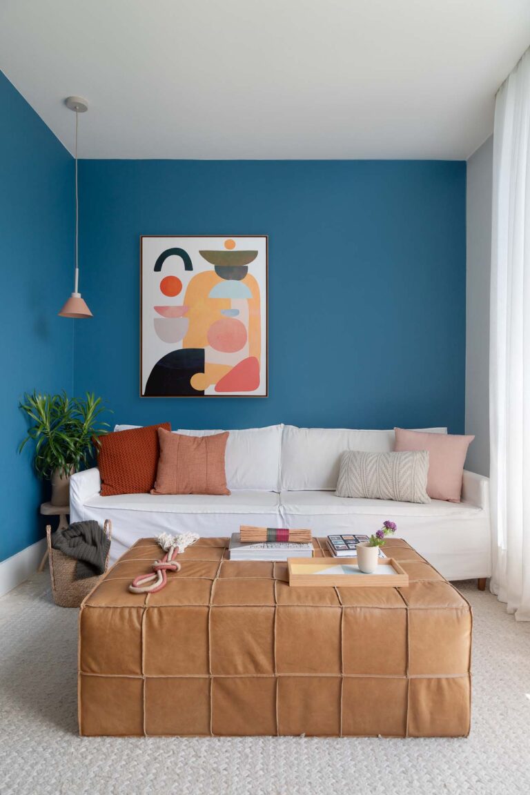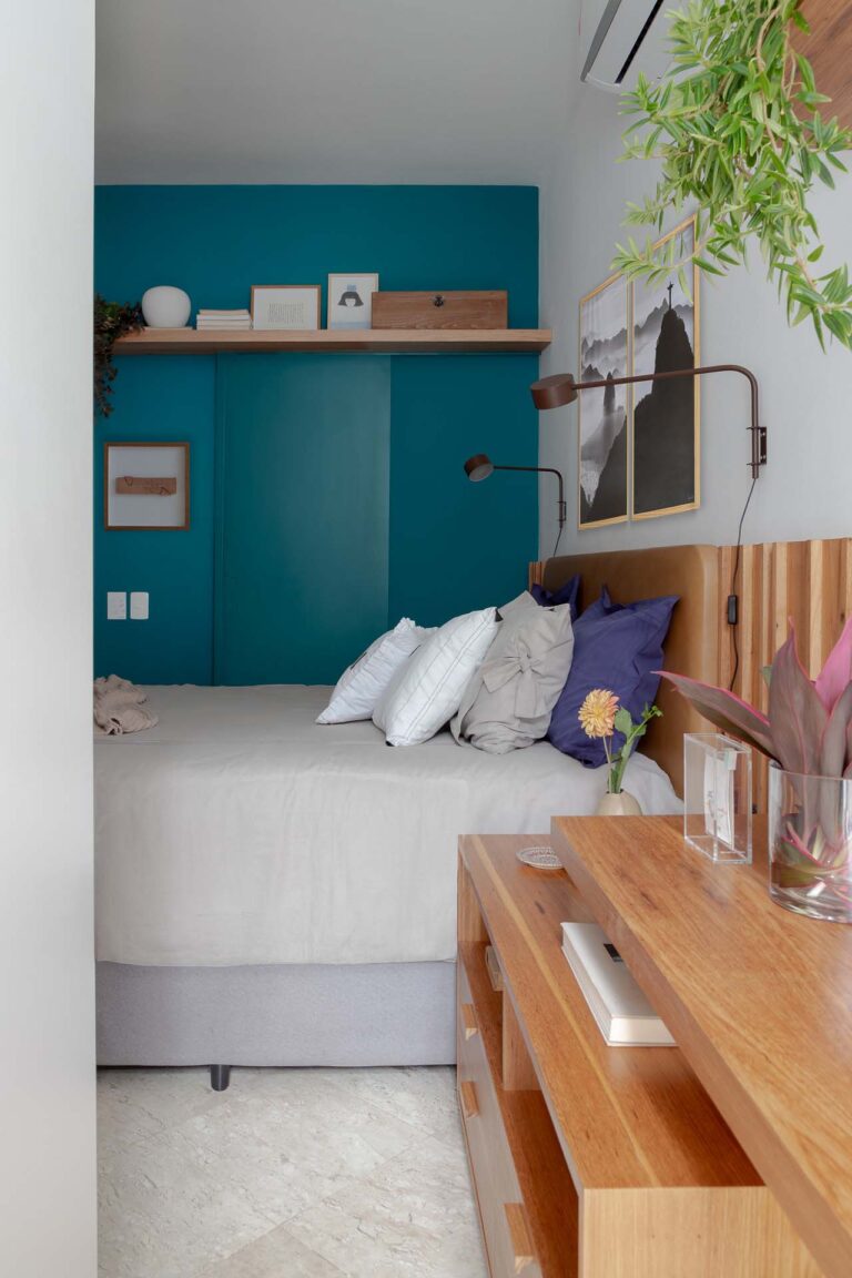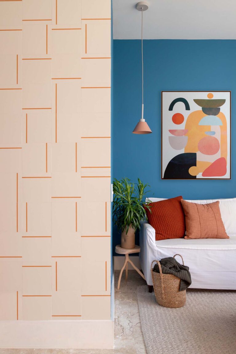 Na área social, o delicado painel de azulejos dialoga com a parede em azul profundo e o pufe terroso. A madeira atua como ponto de aconchego, presente nas prateleiras lineares, na marcenaria da cozinha e na marcante cabeceira ripada da suíte.