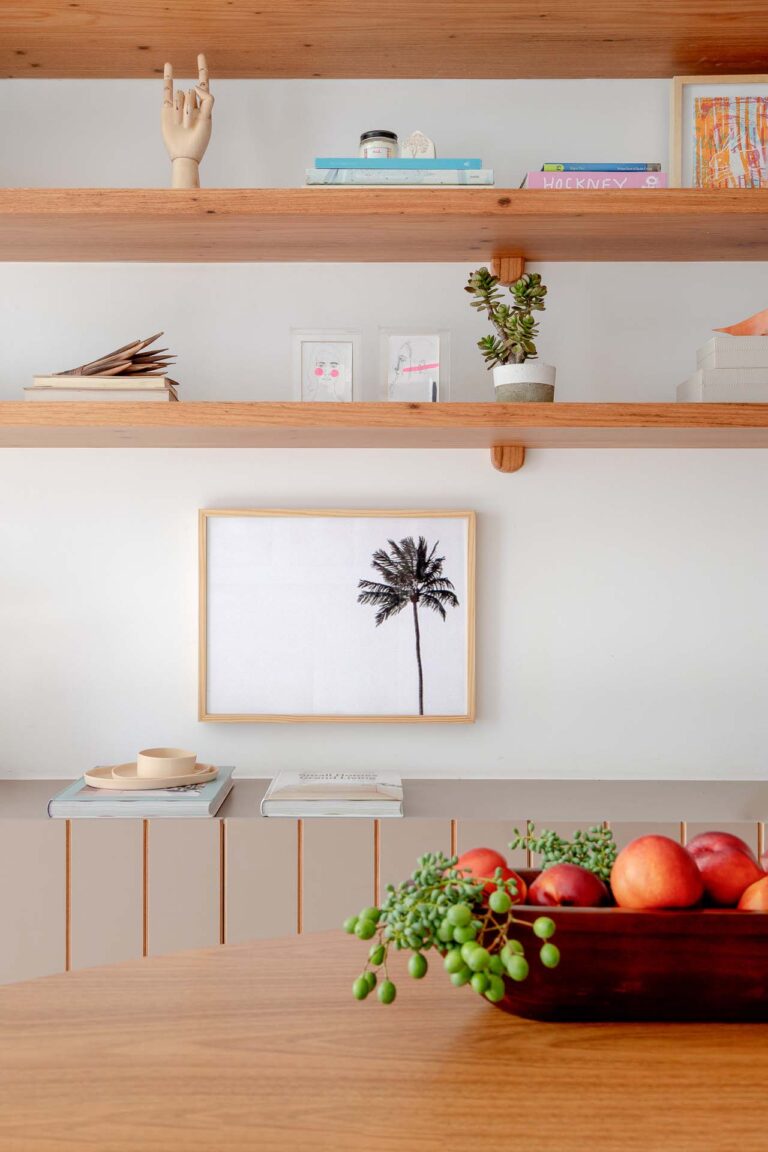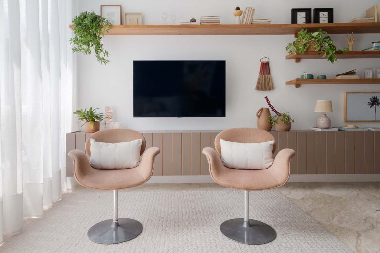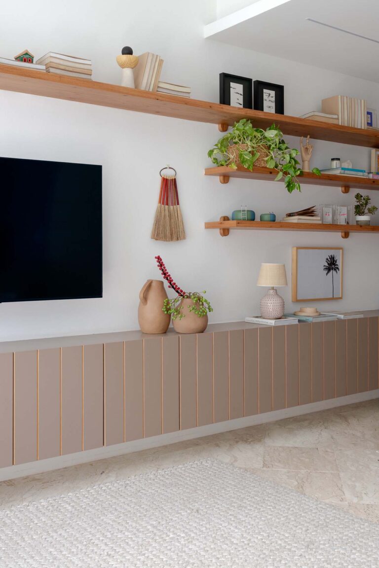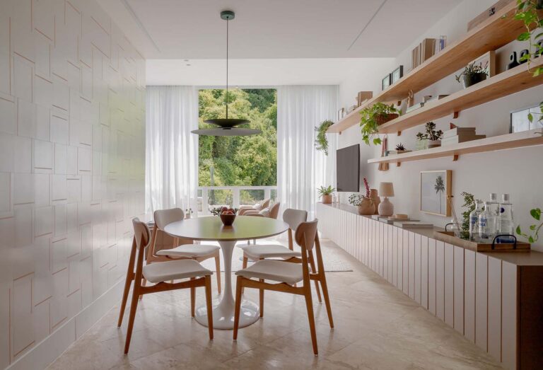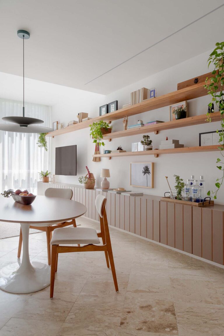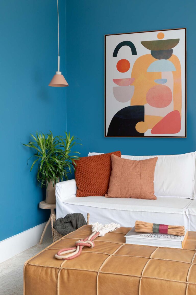 Na área social, o delicado painel de azulejos dialoga com a parede em azul profundo e o pufe terroso. A madeira atua como ponto de aconchego, presente nas prateleiras lineares, na marcenaria da cozinha e na marcante cabeceira ripada da suíte.