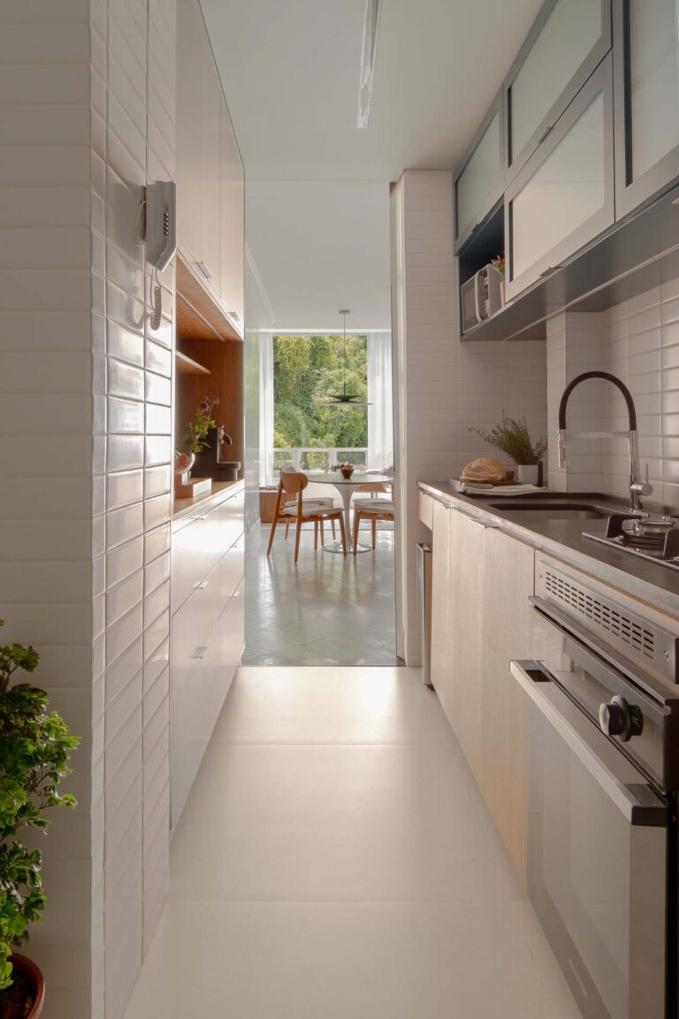 A reforma deste apartamento buscou trazer uma linguagem jovem, minimizando intervenções estruturais. A reconfiguração transformou dois banheiros sociais em uma suíte elegante e remodelou totalmente a cozinha, tornando-a altamente funcional.