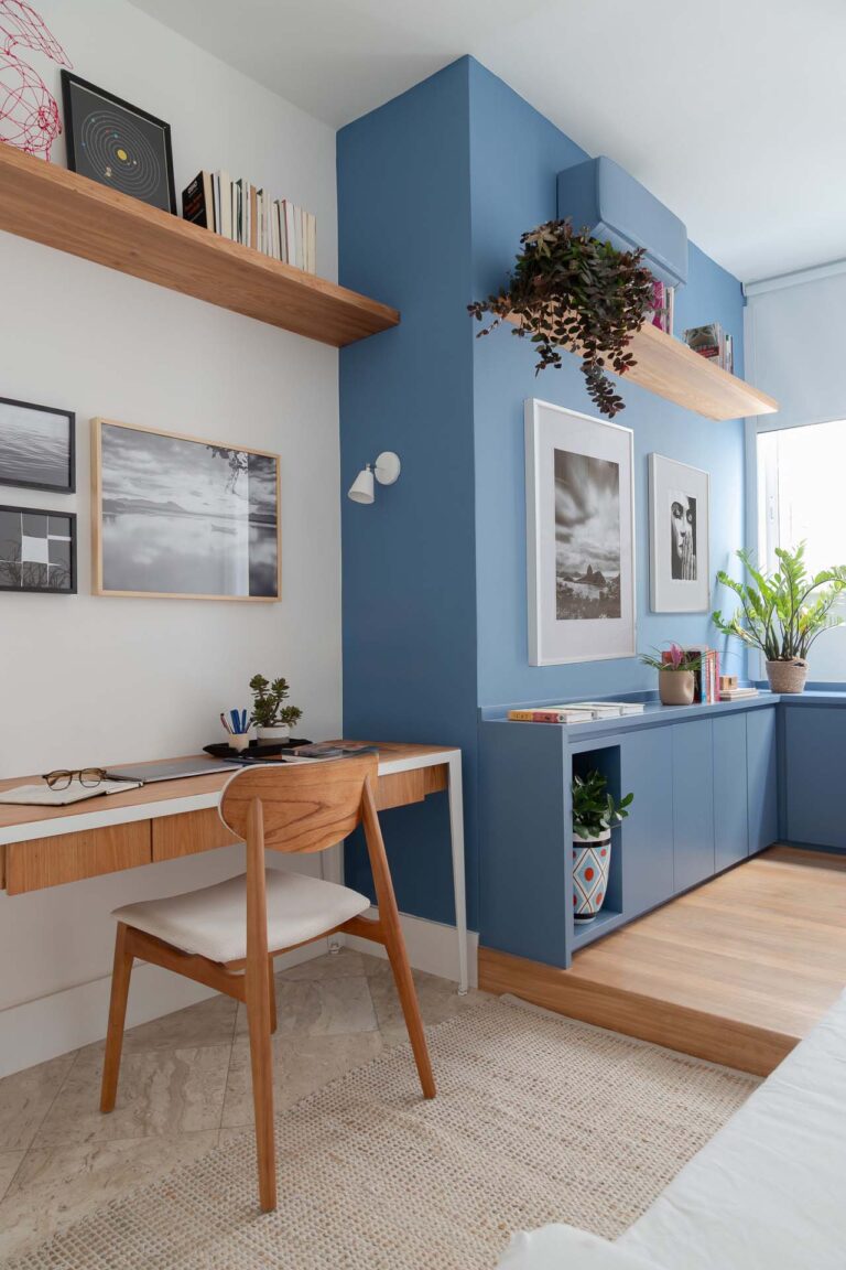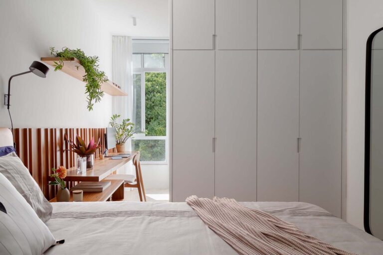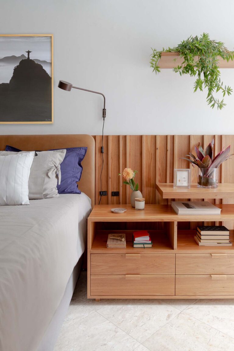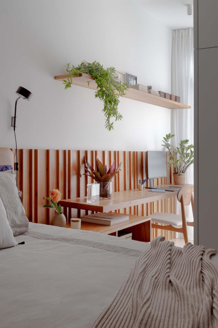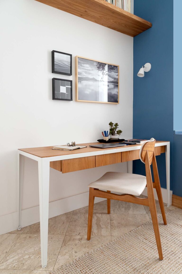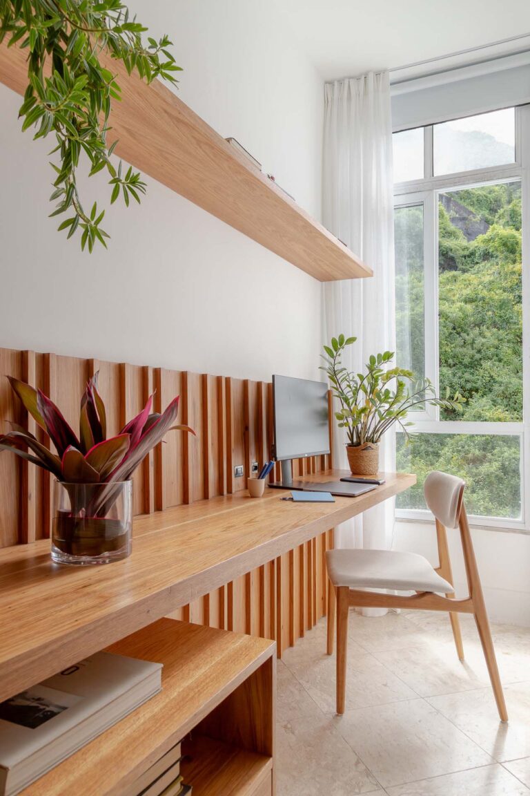 No escritório, uma viga invertida no piso foi resolvida de forma engenhosa com a criação de um tablado de madeira, demarcando o ambiente de maneira convidativa. Na suíte, a rotina ganha praticidade e conforto com um home office cuidadosamente integrado ao dormitório.