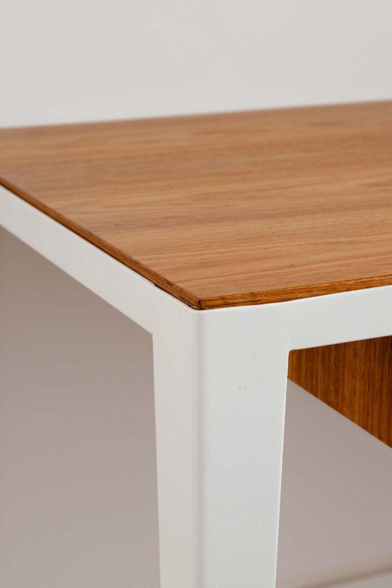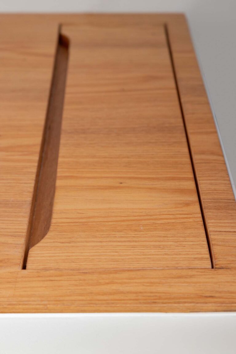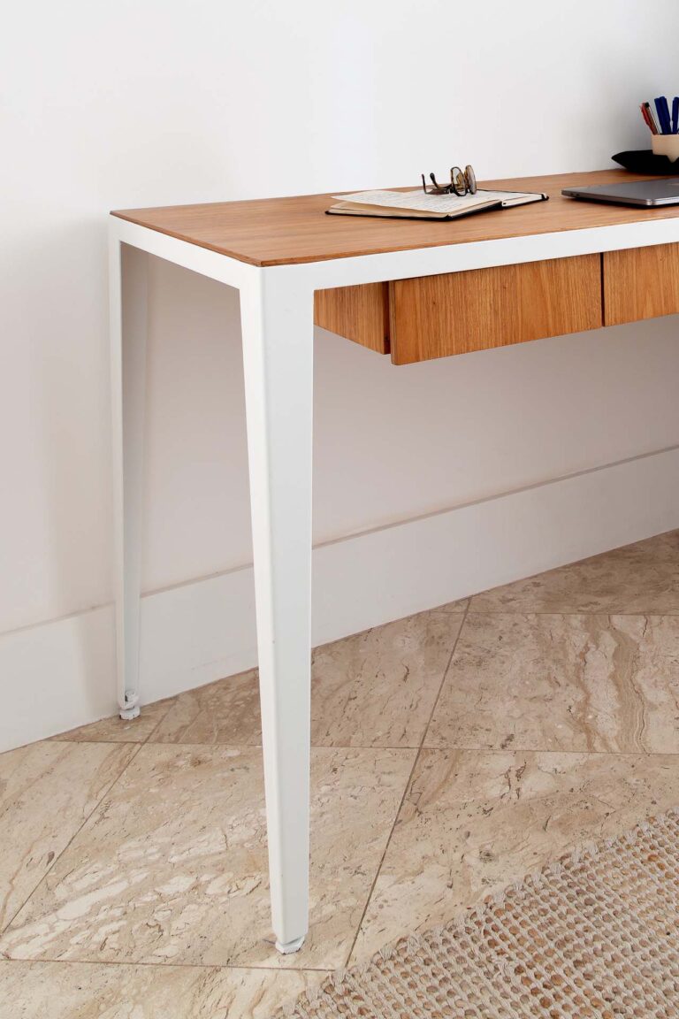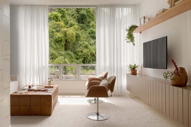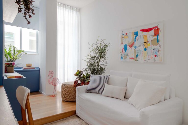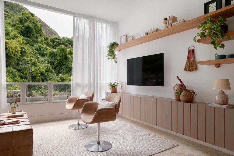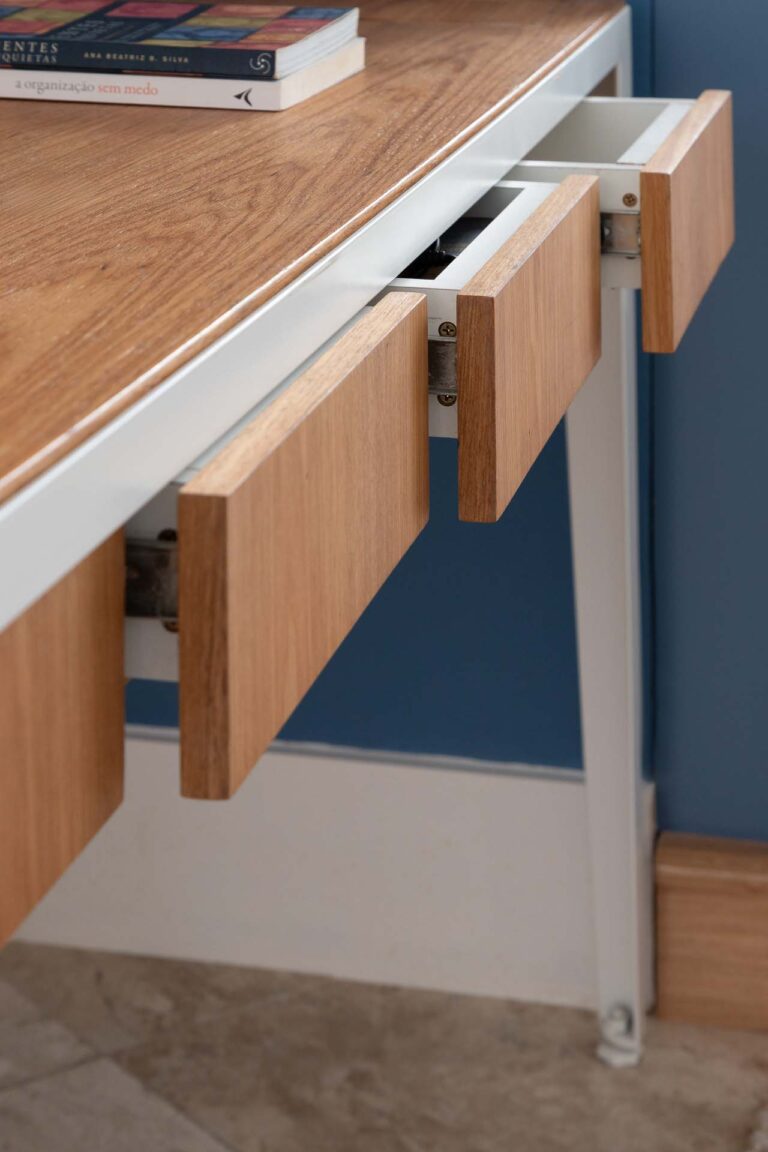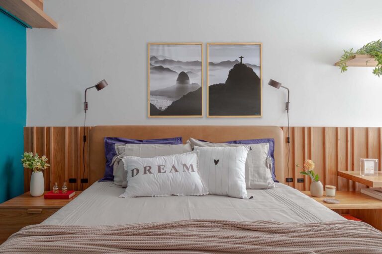 No escritório, uma viga invertida no piso foi resolvida de forma engenhosa com a criação de um tablado de madeira, demarcando o ambiente de maneira convidativa. Na suíte, a rotina ganha praticidade e conforto com um home office cuidadosamente integrado ao dormitório.