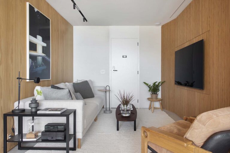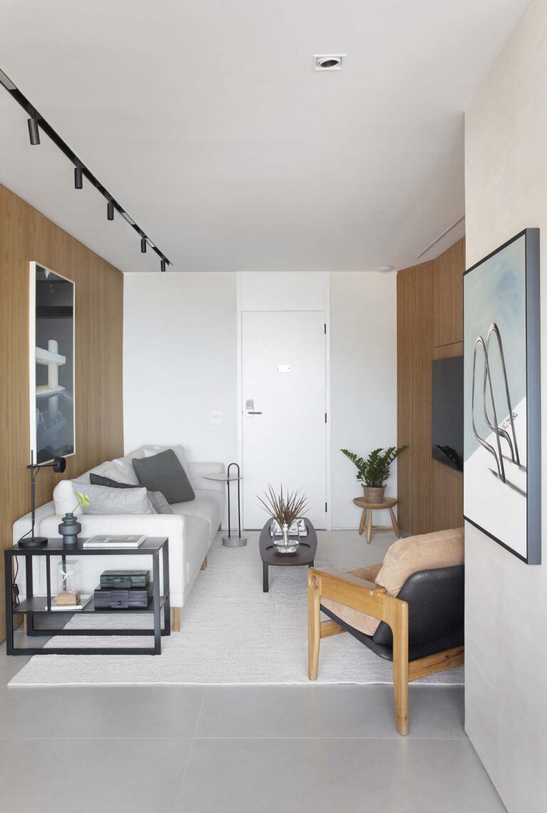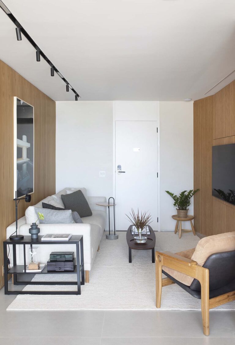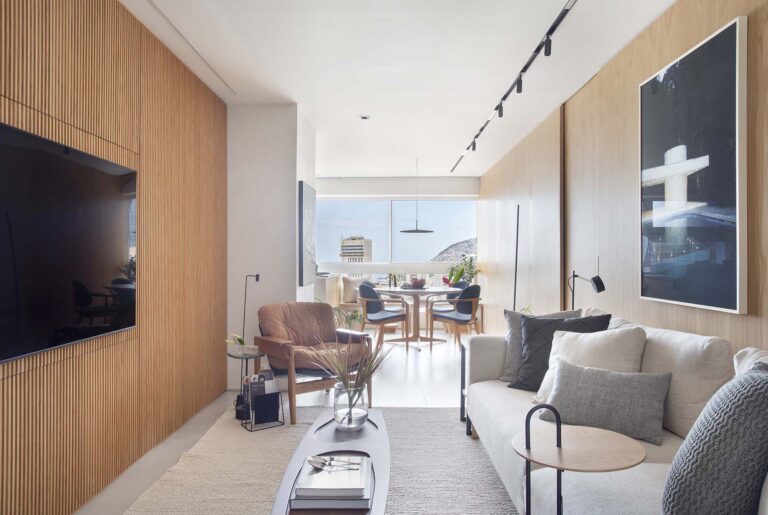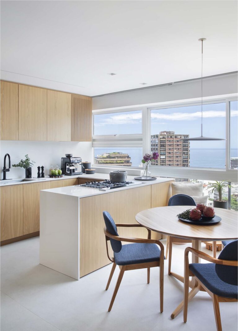 O ponto de partida foi transformar a planta original, que possui um desafiador formato em “fatia de pizza”, em um lugar com alma e fluidez, pronto para receber os proprietários em suas temporadas no Brasil ou acolher um público selecionado para locação.