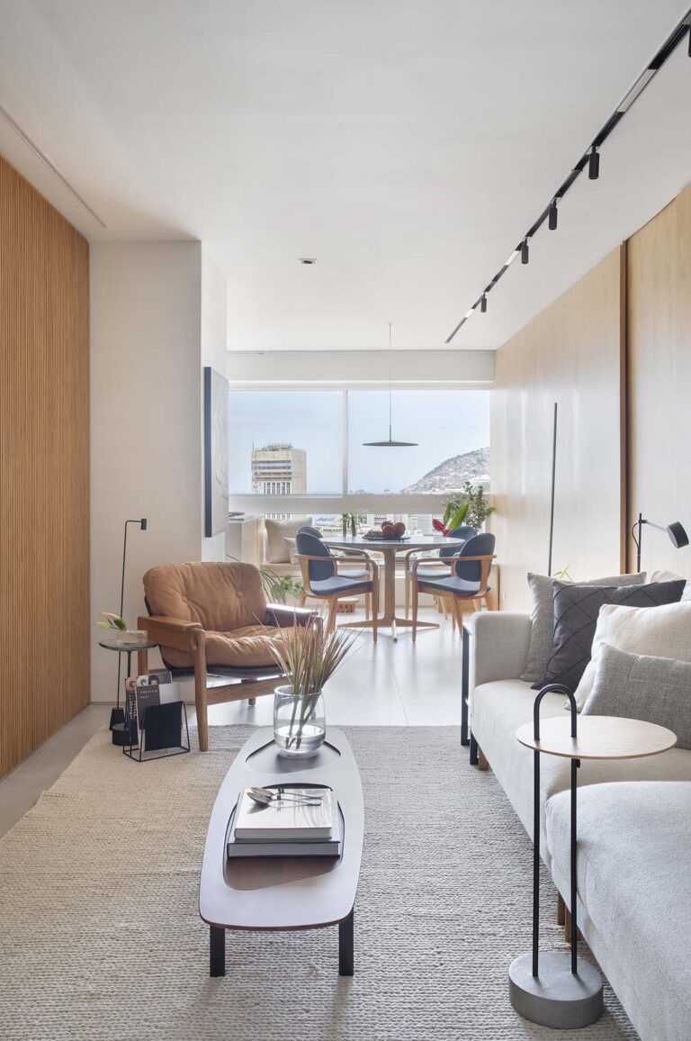 O mobiliário exalta o design nacional com peças assinadas por nomes como Sergio Rodrigues e Arthur Casas, pontuadas por toques de azul profundo e obras de arte em preto e cinza, resultando em um ambiente que respira sofisticação e acolhimento, tipicamente fiel ao espírito do Estúdio Popa.