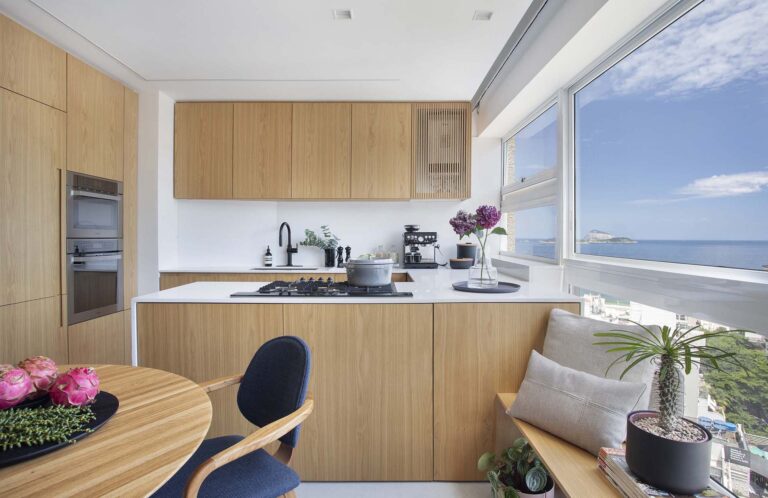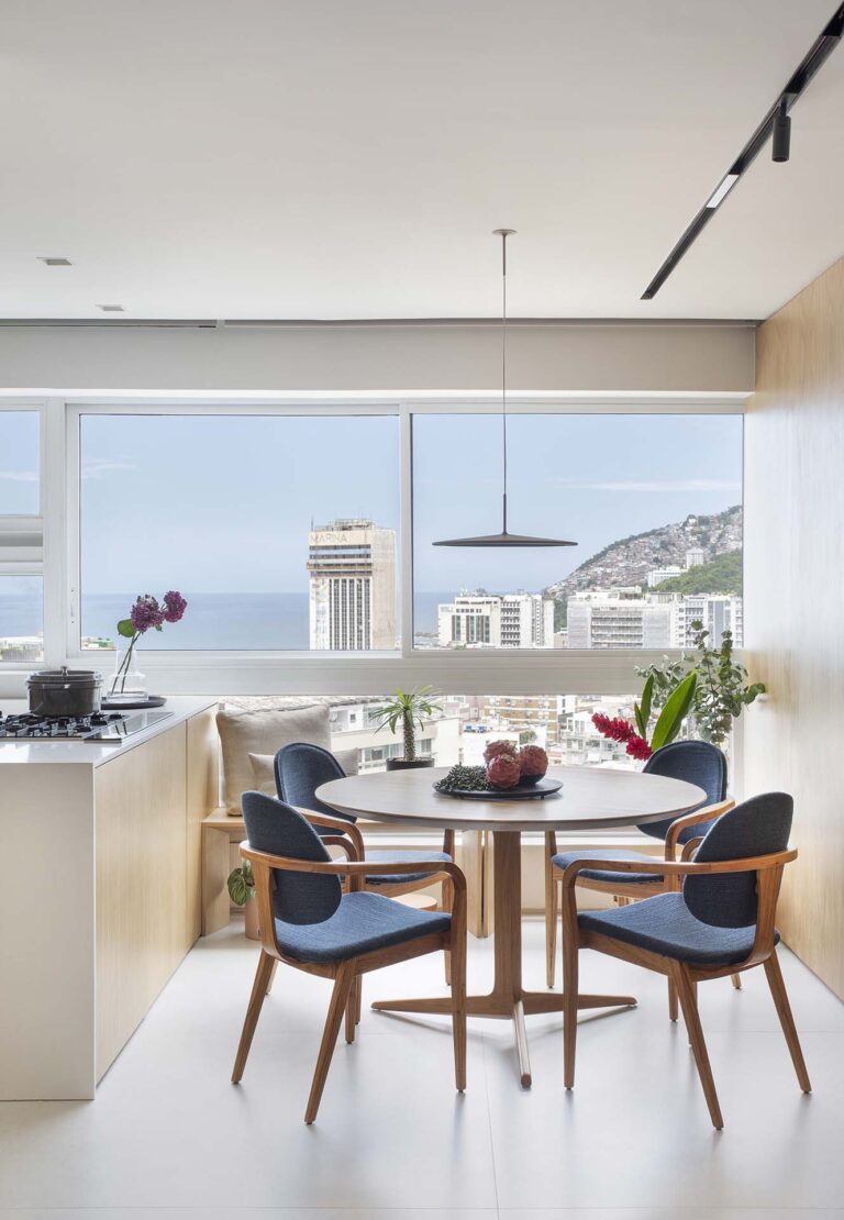 Localizado no 17º andar de um icônico edifício circular no Leblon, este apartamento foi redesenhado para ser o refúgio carioca de dois empresários que vivem nos Estados Unidos.