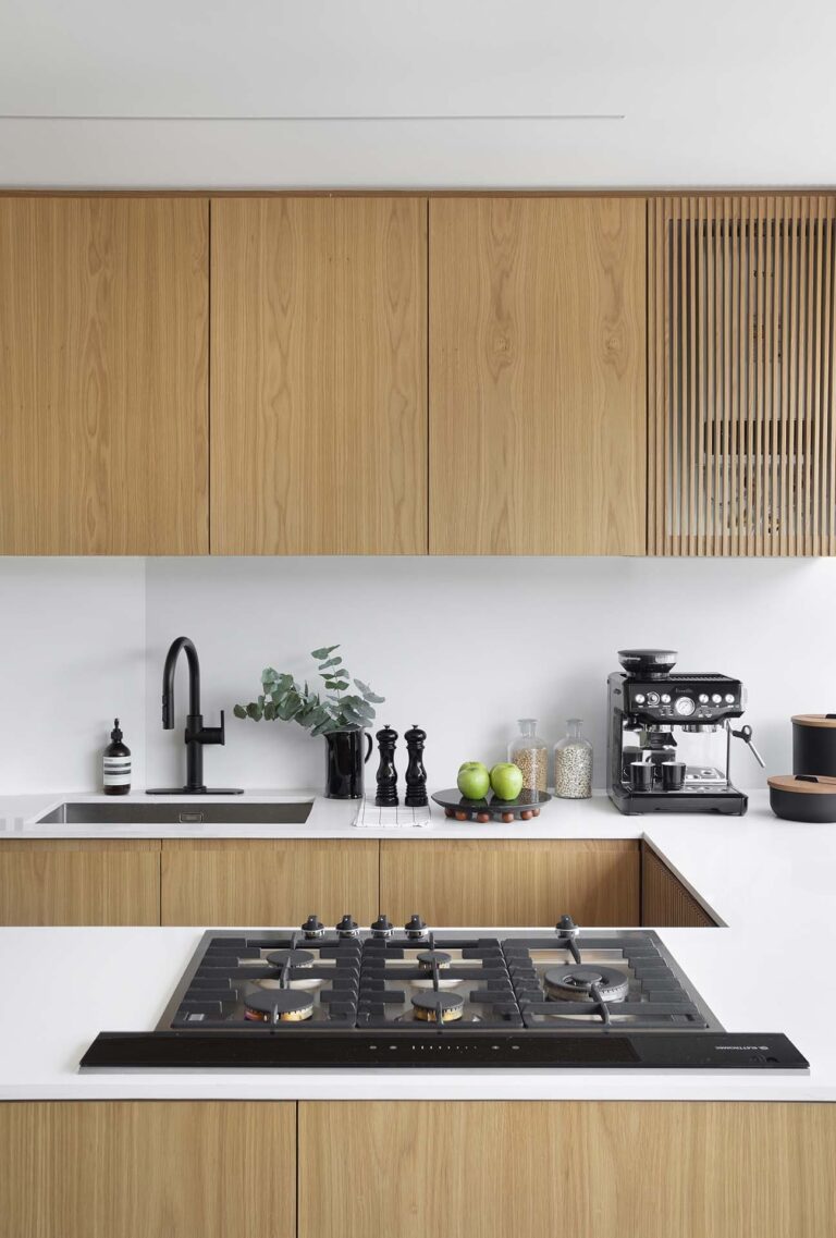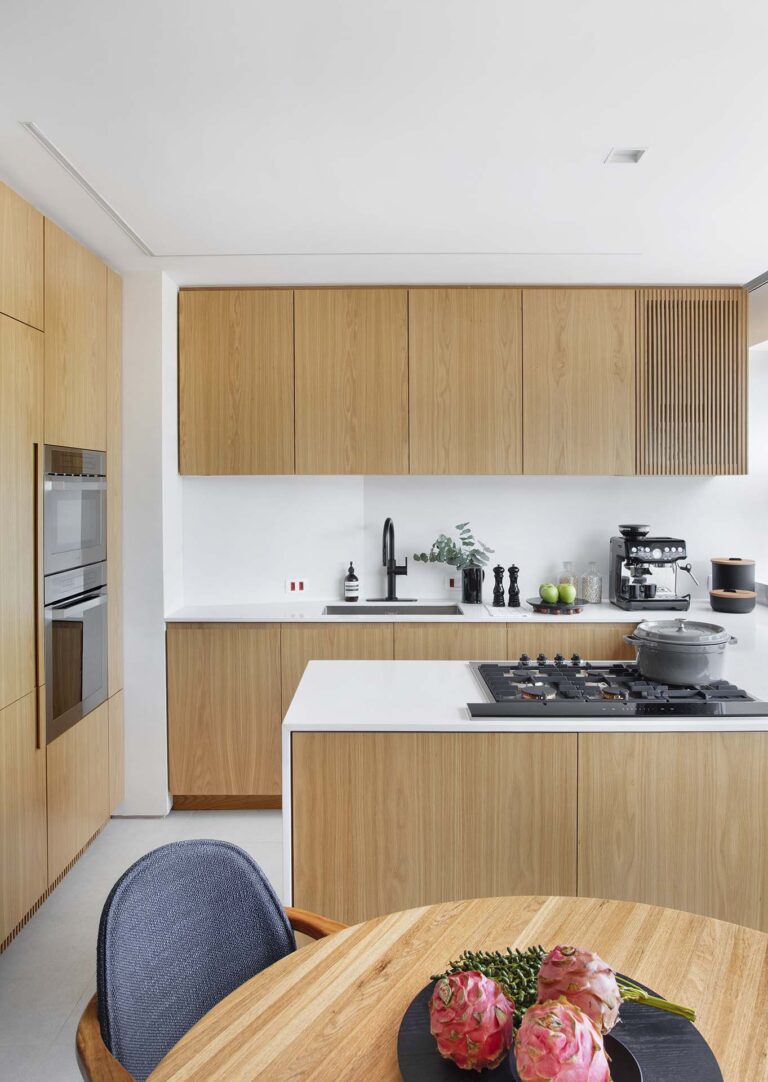 A principal solução espacial consistiu na abertura total da cozinha para a sala. Para lidar com as angulações complexas das paredes, a marcenaria em carvalho americano camufla eletrodomésticos e armários, mas também regulariza o layout, criando uma sensação de continuidade.
