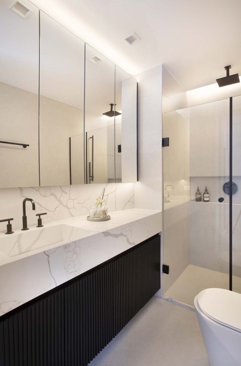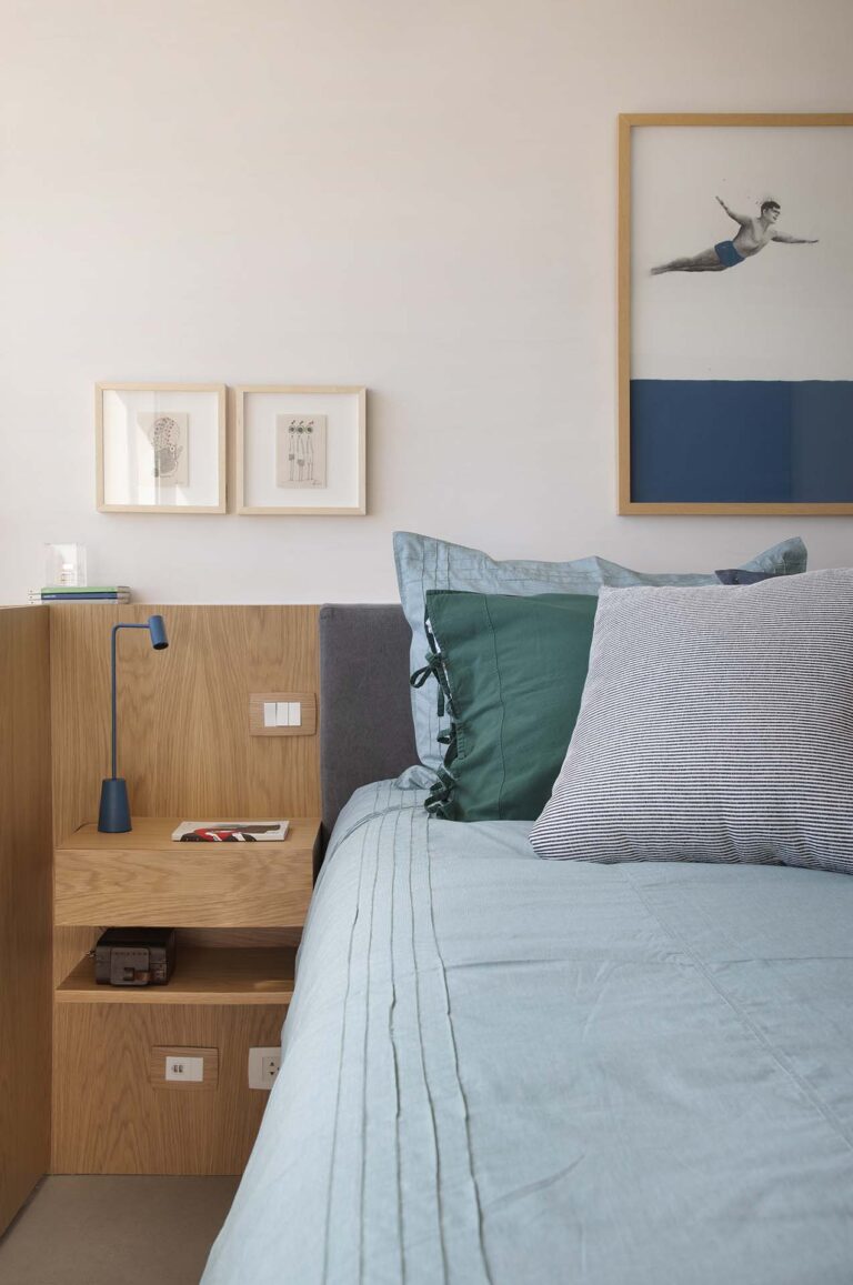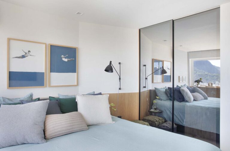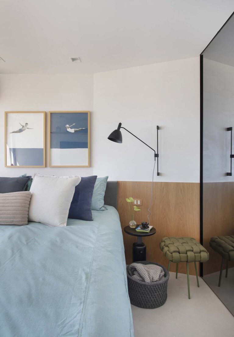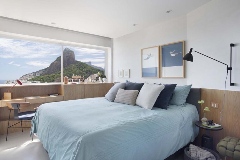 No quarto, o closet recebeu portas em vidro reflecta, que além de conferirem leveza, refletem a vista do mar, enquanto uma estrutura estratégica sob a esquadria organiza os equipamentos técnicos e oferece um pequeno posto de trabalho funcional.