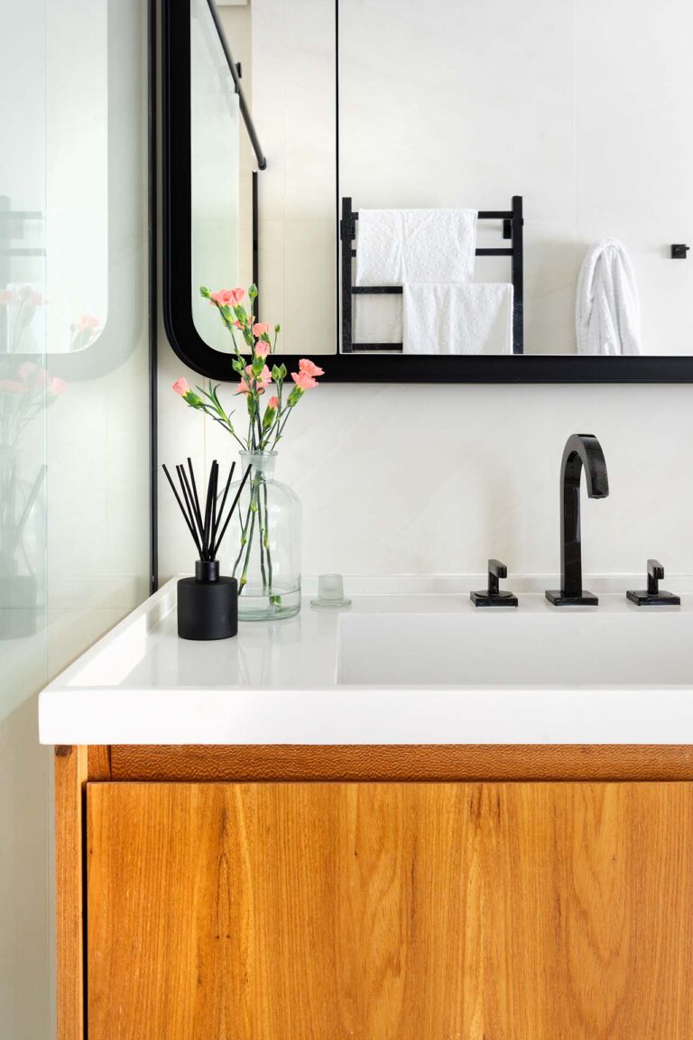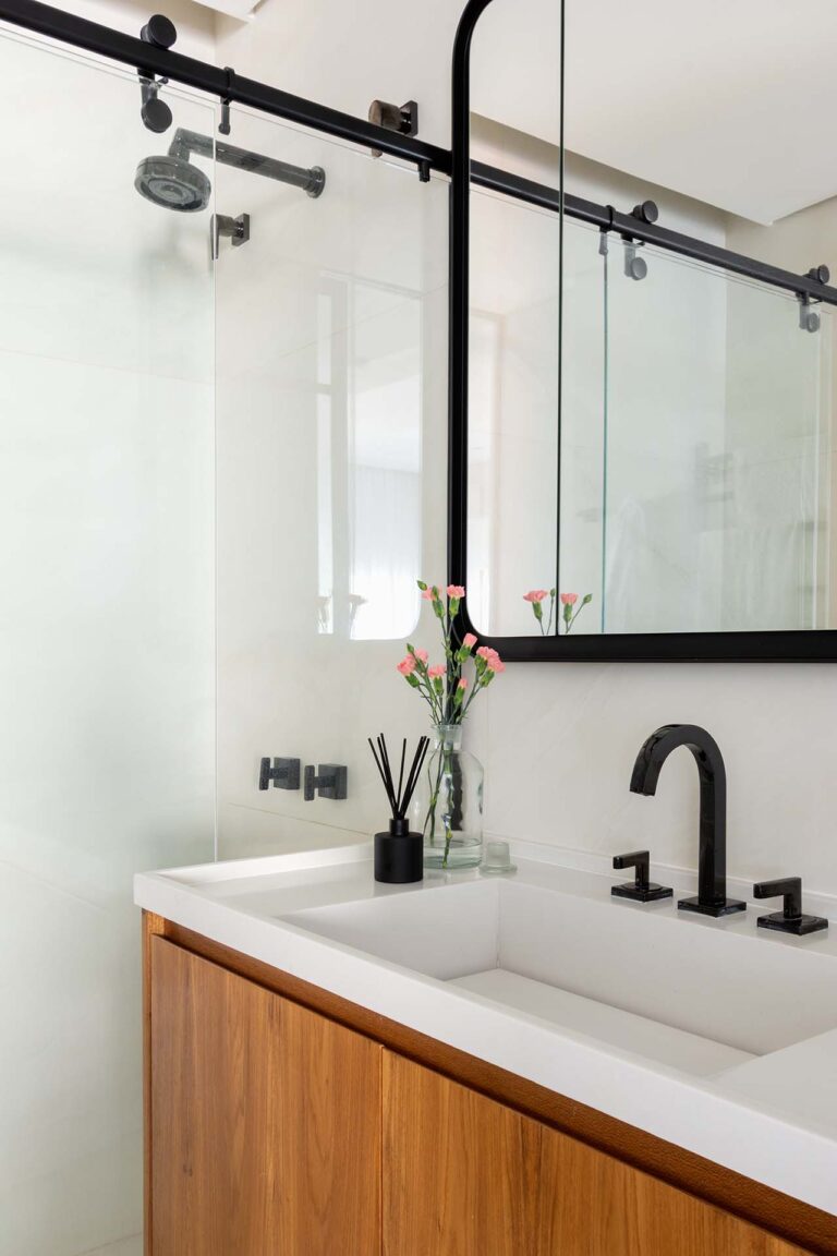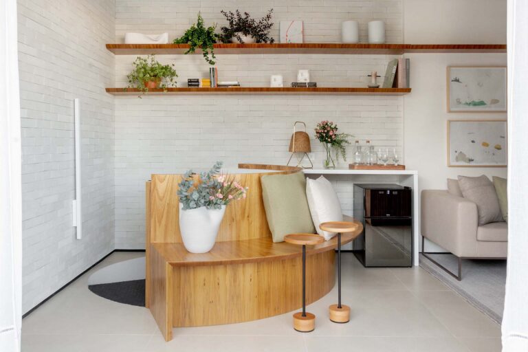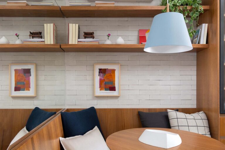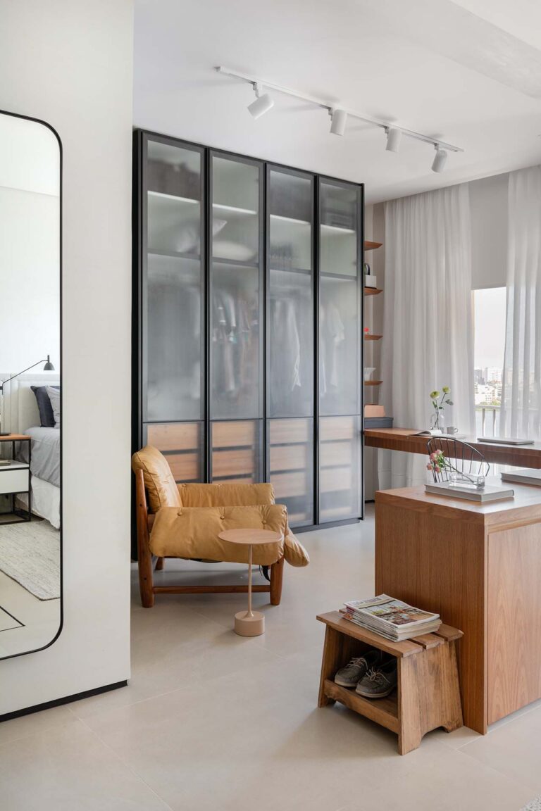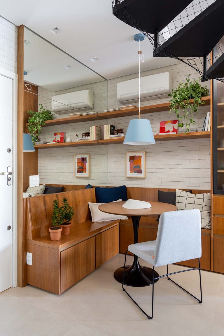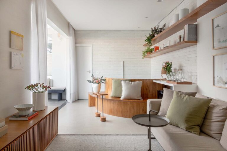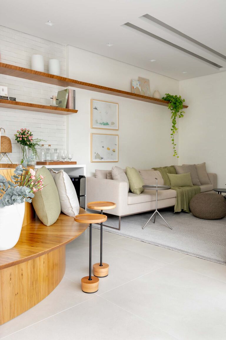 O projeto explora o equilíbrio entre o rigor do estilo industrial e o calor dos elementos naturais. O piso em porcelanato com textura de pedra e os detalhes em tijolinho trazem uma base rústica e urbana, aquecida pela marcenaria em freijó e pela icônica poltrona Mole, uma peça de acrvo familiar restaurada.