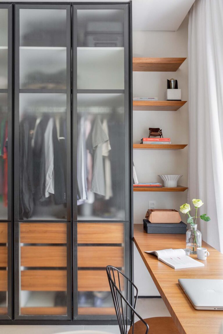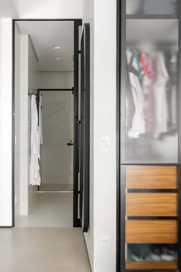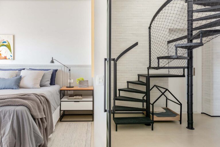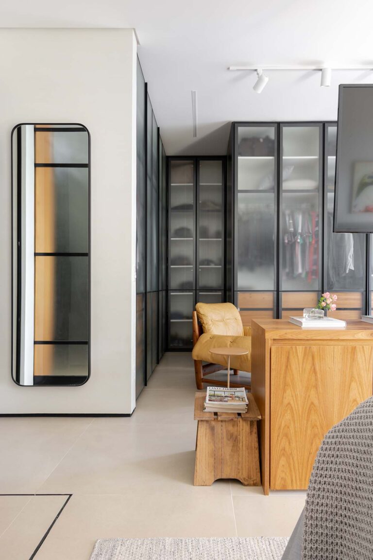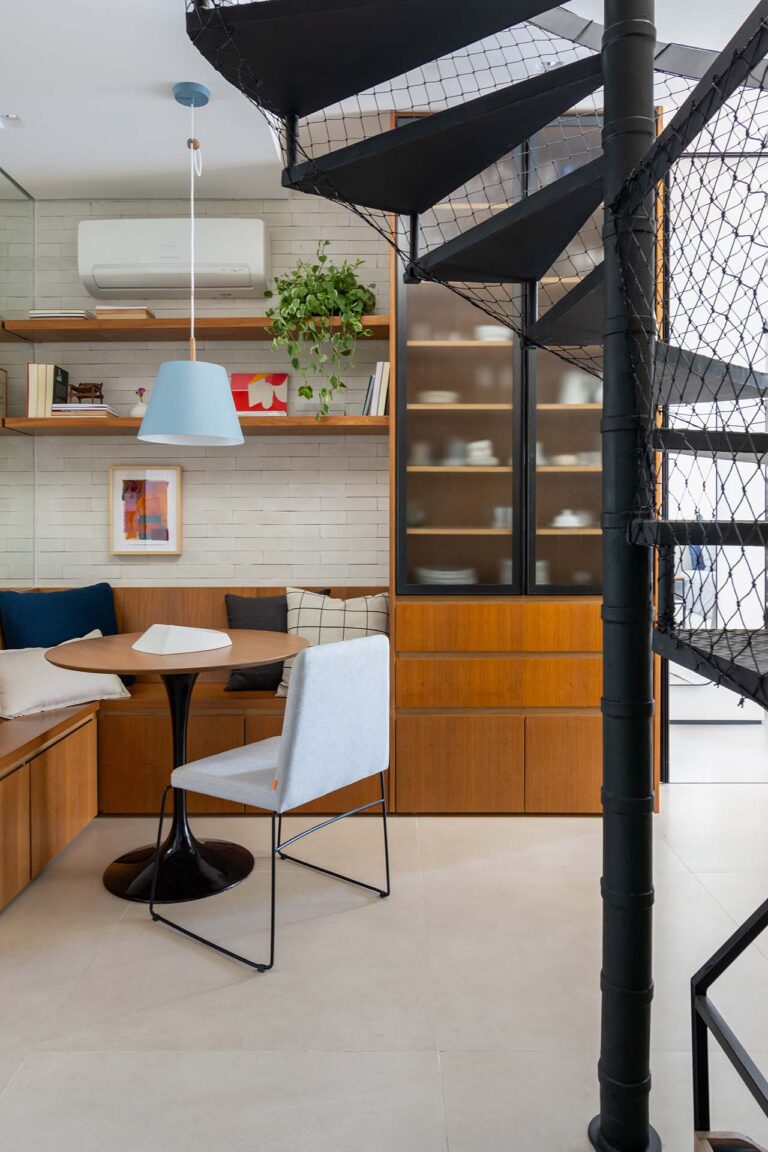 No primeiro andar, a inversão da posição da cama permitiu que o casal acordasse com uma vista privilegiada da Lagoa. A transição entre a área de refeições e o setor íntimo é feita por portas de correr em serralheria e vidro mini boreal, que garantem privacidade sem interromper a passagem da luz.