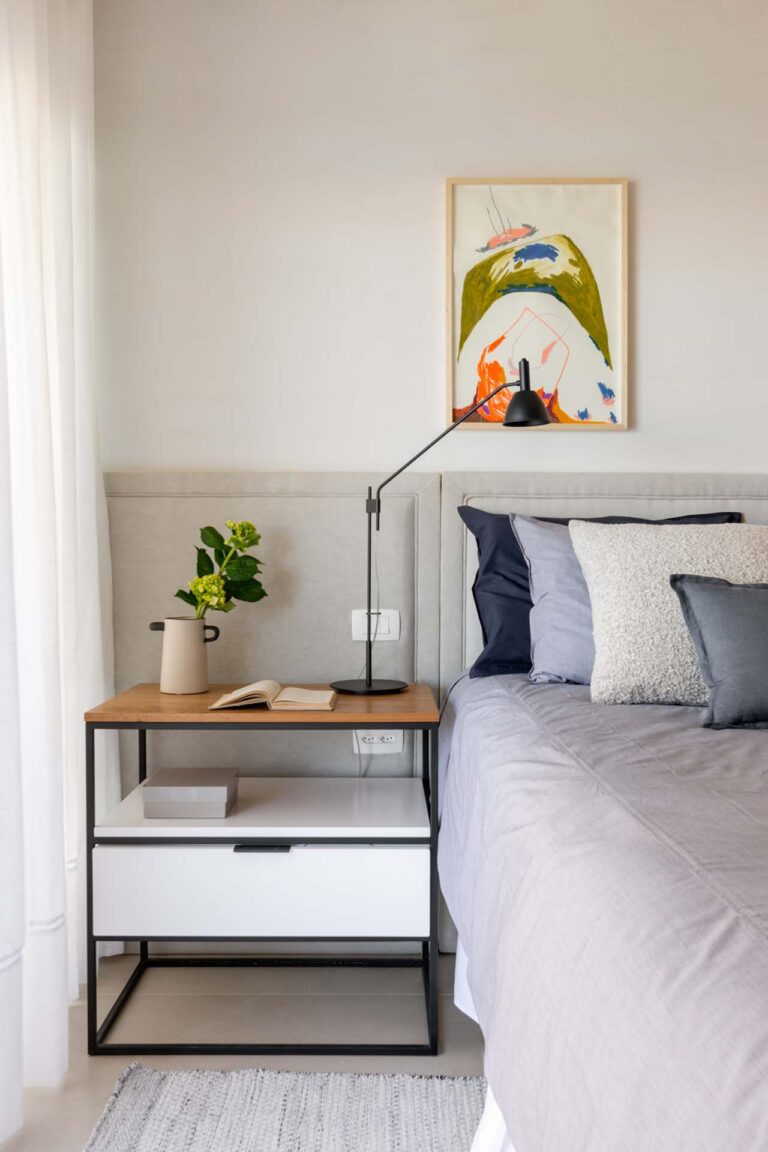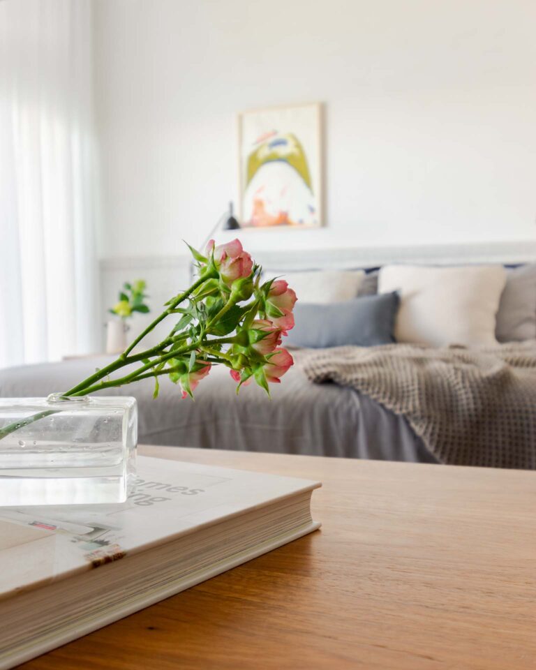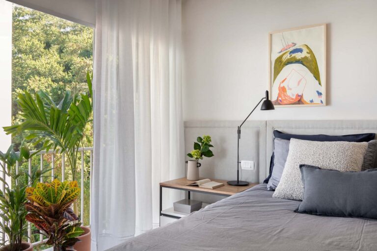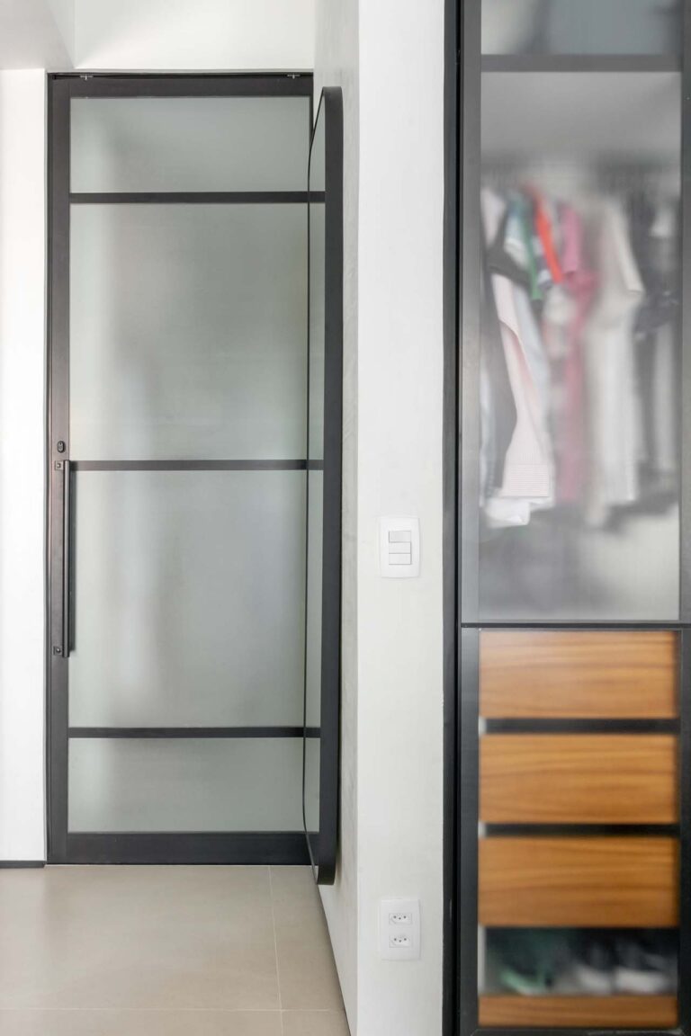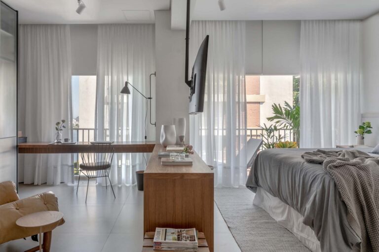 No primeiro andar, a inversão da posição da cama permitiu que o casal acordasse com uma vista privilegiada da Lagoa. A transição entre a área de refeições e o setor íntimo é feita por portas de correr em serralheria e vidro mini boreal, que garantem privacidade sem interromper a passagem da luz.