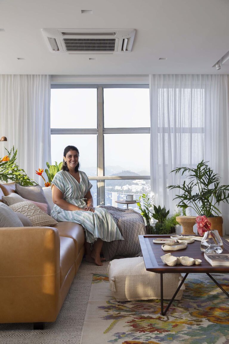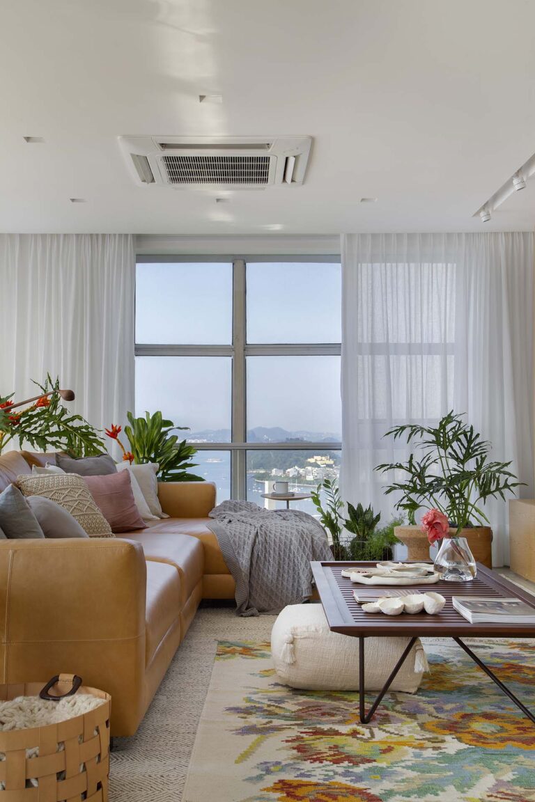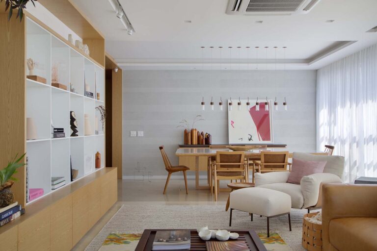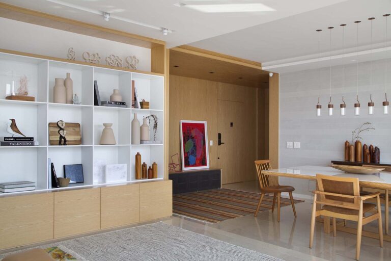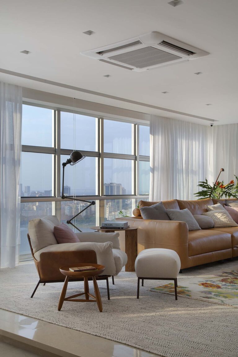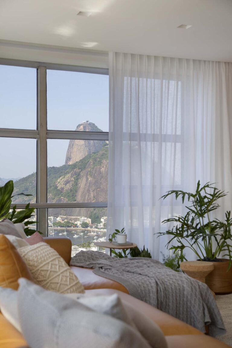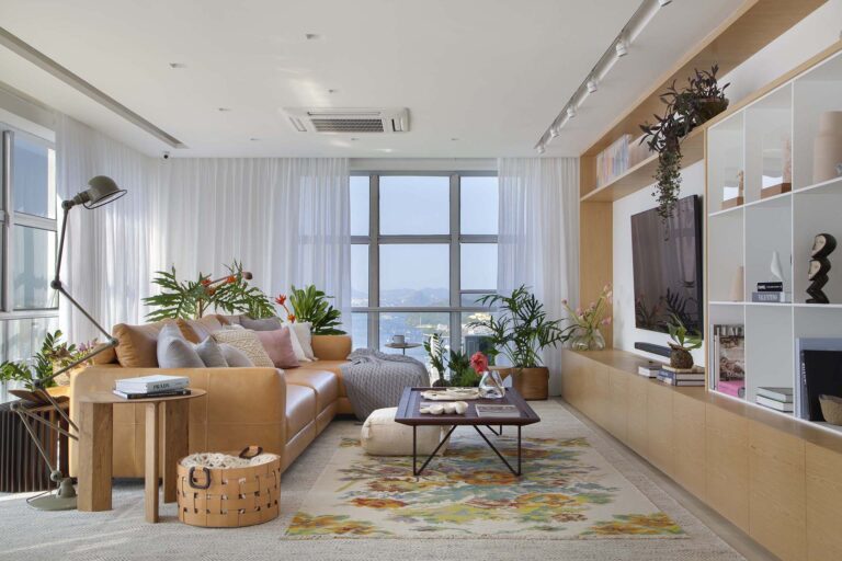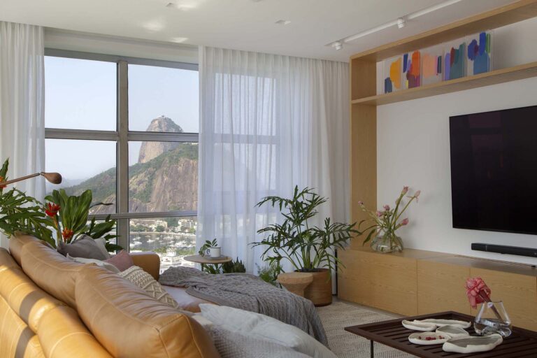 A paleta de cores secas e suaves na sala dialoga com a sobreposição de tapetes e o design assinado de ícones como Sergio Rodrigues e Arthur Casas. A madeira freijó e o carvalho americano aquecem os ambientes, contrastando com o rigor da serralheria preta nas esquadrias.