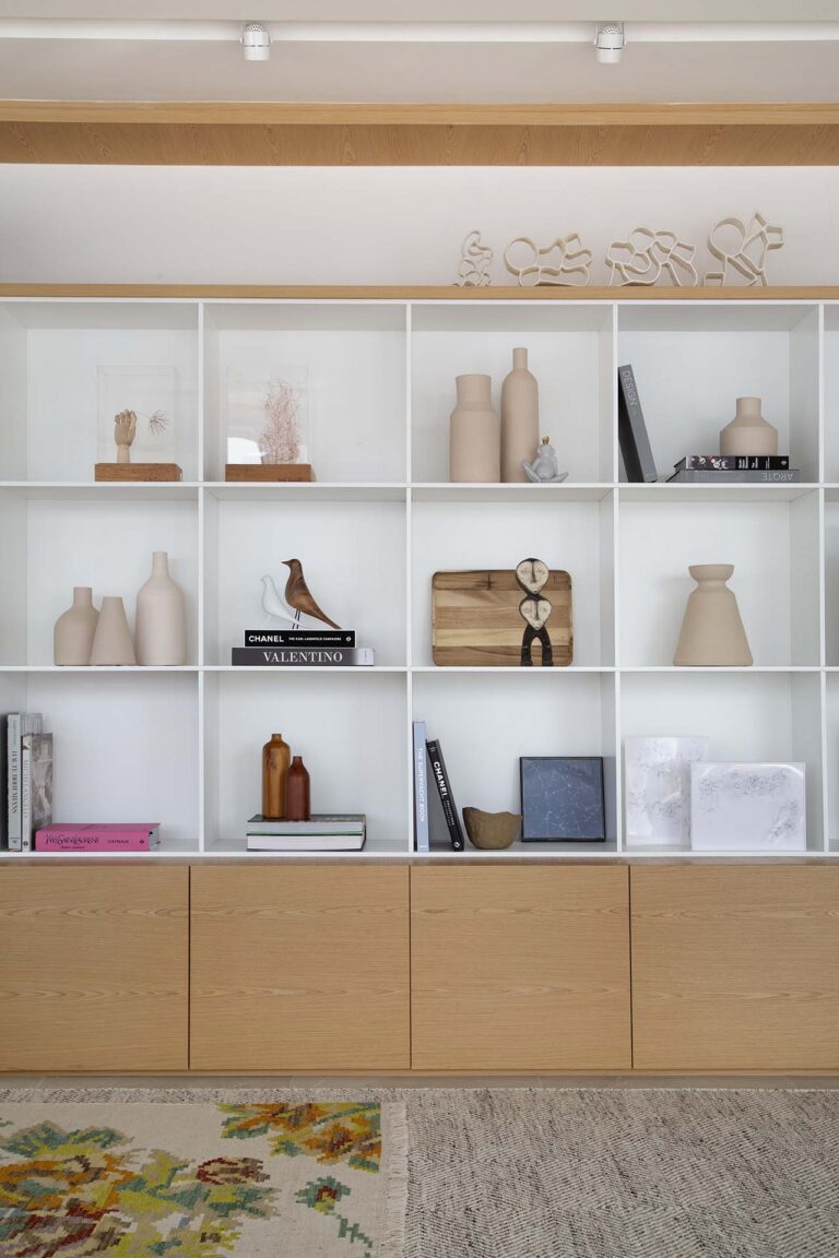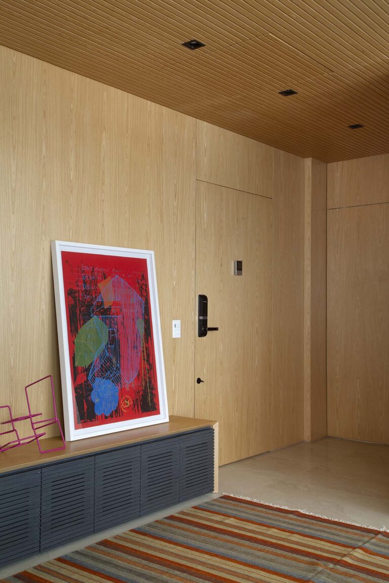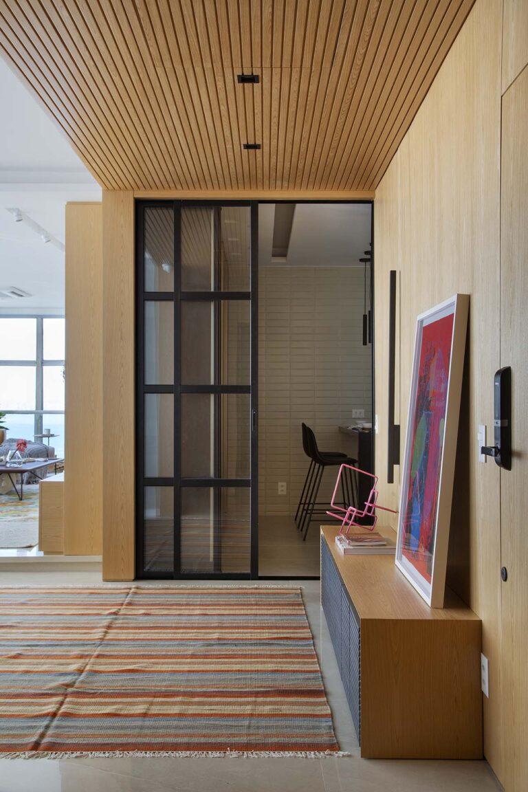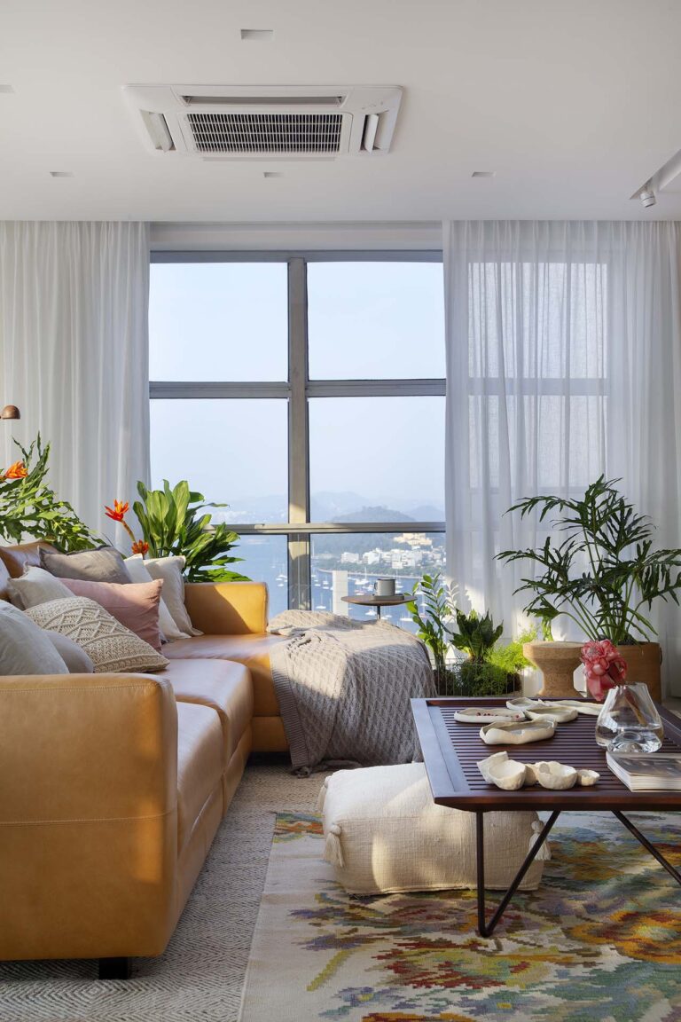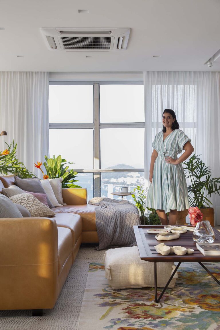 A paleta de cores secas e suaves na sala dialoga com a sobreposição de tapetes e o design assinado de ícones como Sergio Rodrigues e Arthur Casas. A madeira freijó e o carvalho americano aquecem os ambientes, contrastando com o rigor da serralheria preta nas esquadrias.