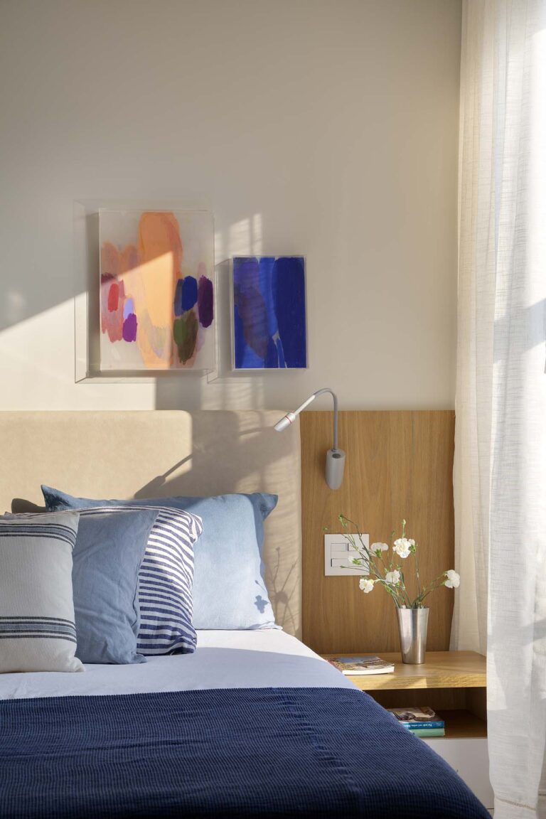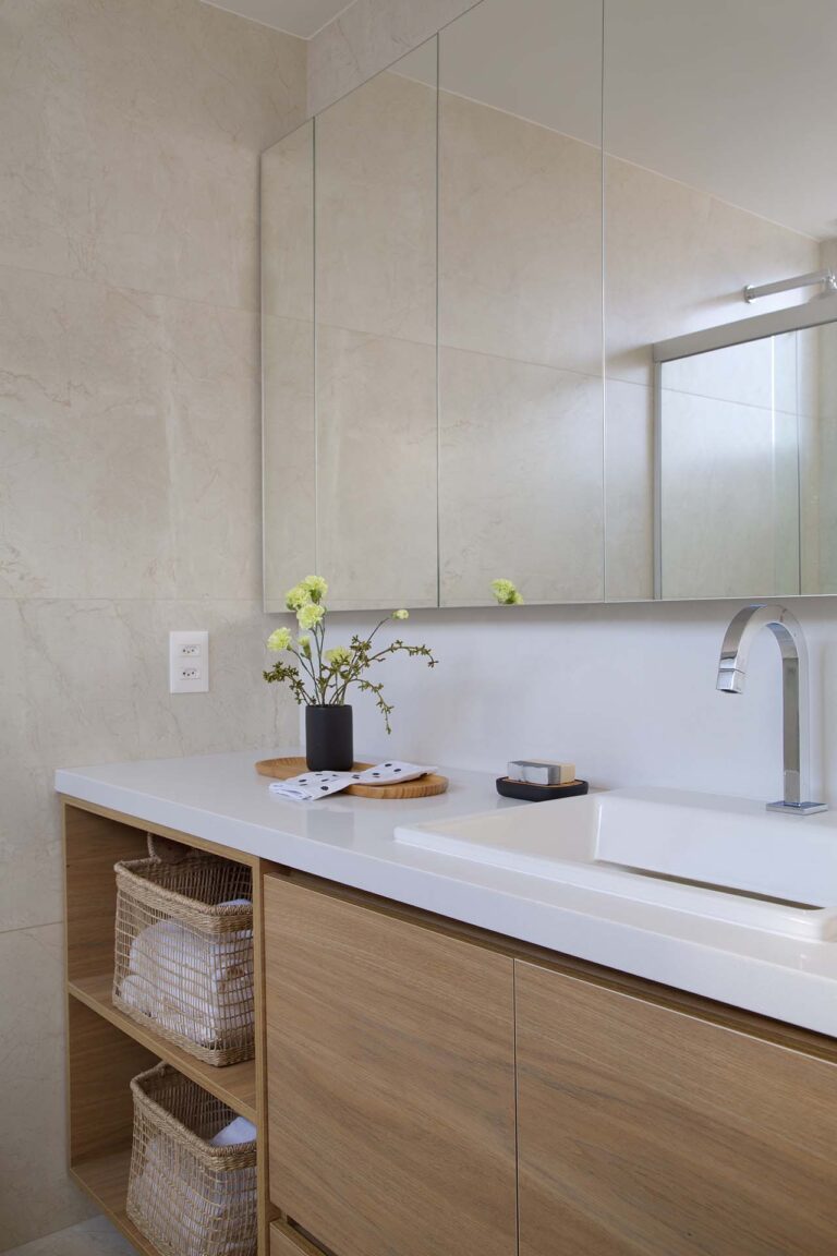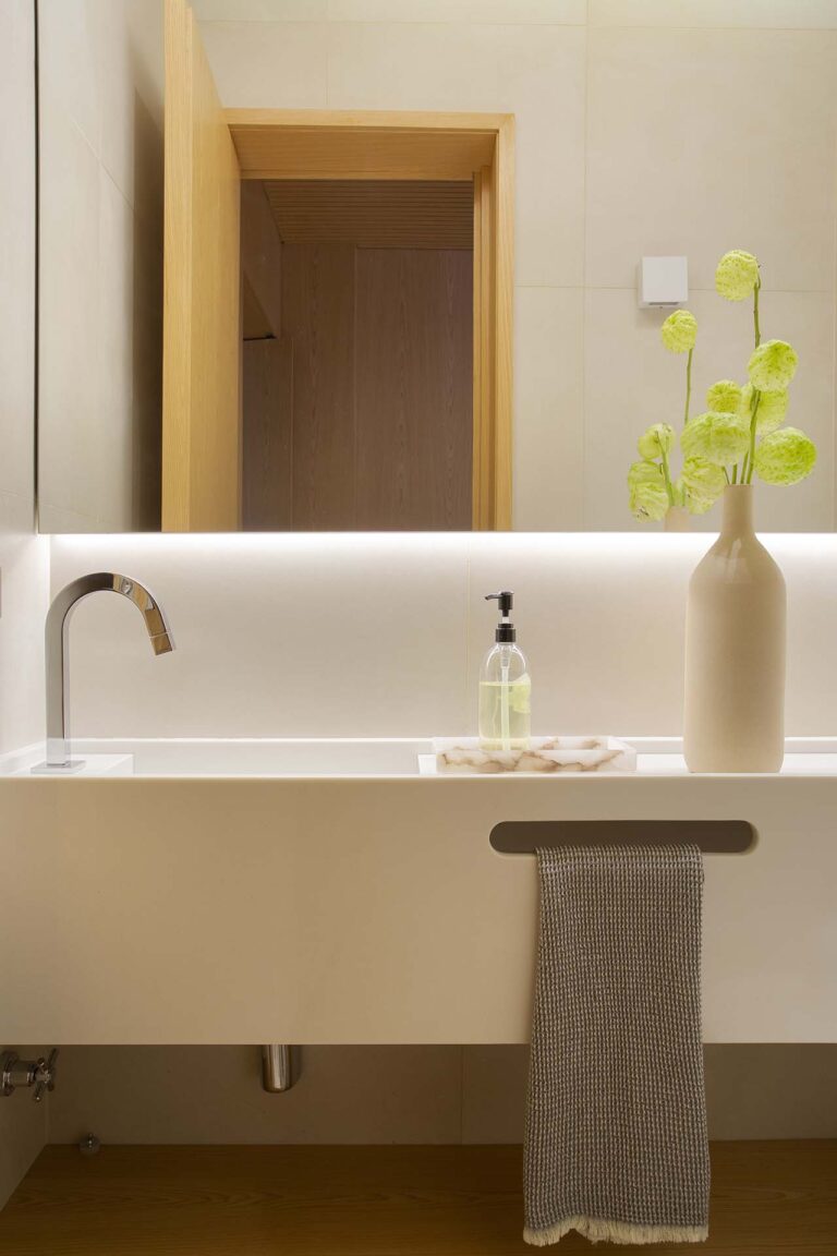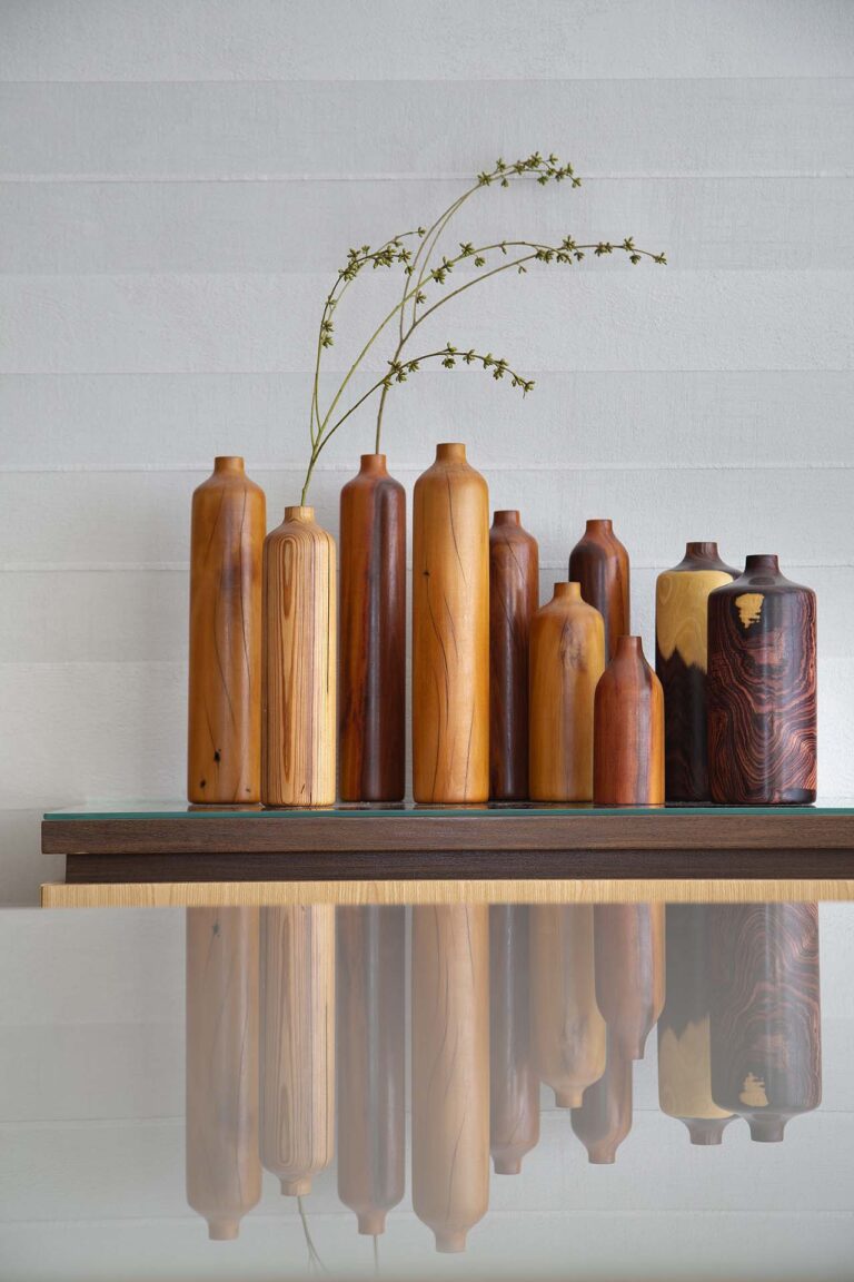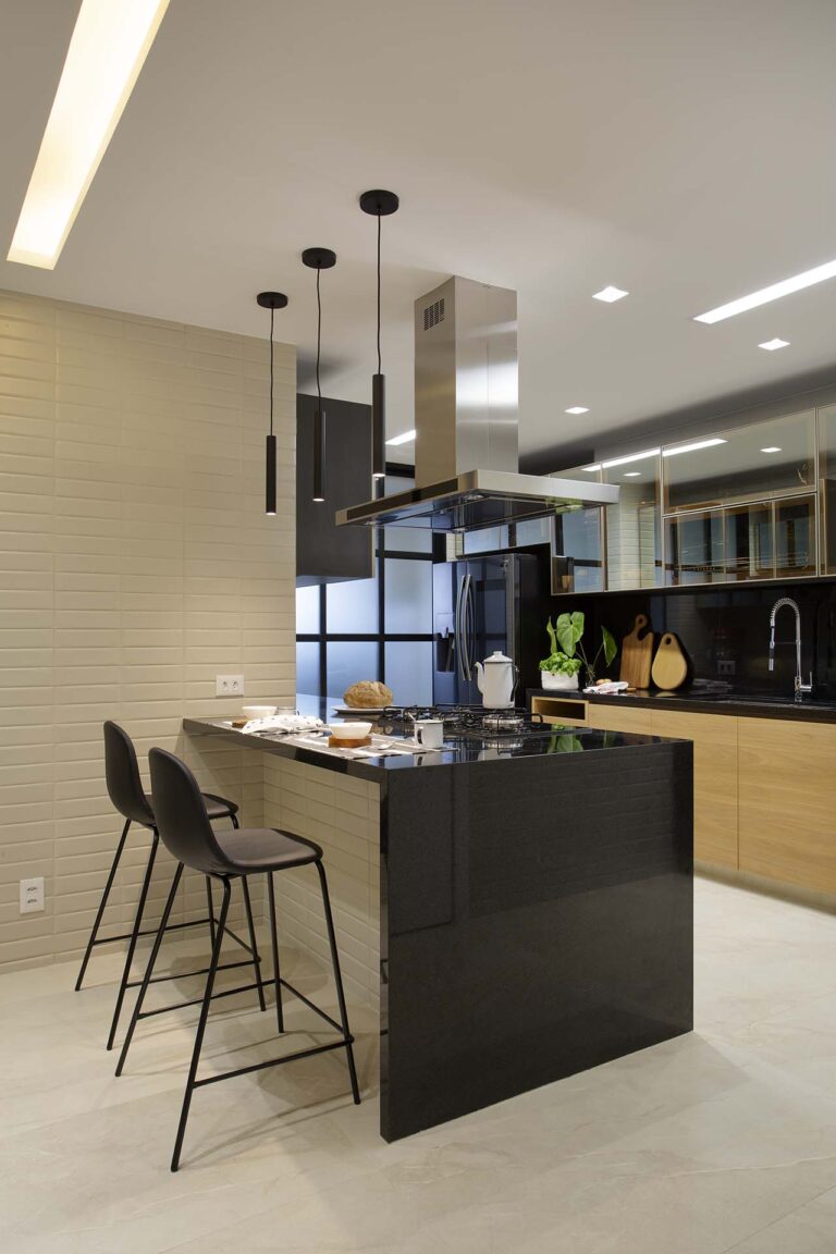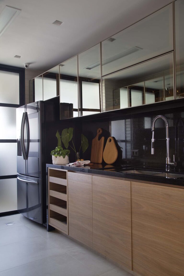 A paleta de cores secas e suaves na sala dialoga com a sobreposição de tapetes e o design assinado de ícones como Sergio Rodrigues e Arthur Casas. A madeira freijó e o carvalho americano aquecem os ambientes, contrastando com o rigor da serralheria preta nas esquadrias.