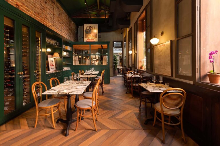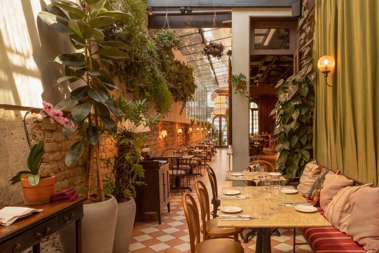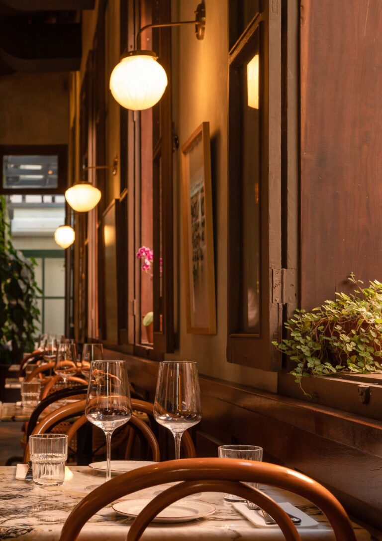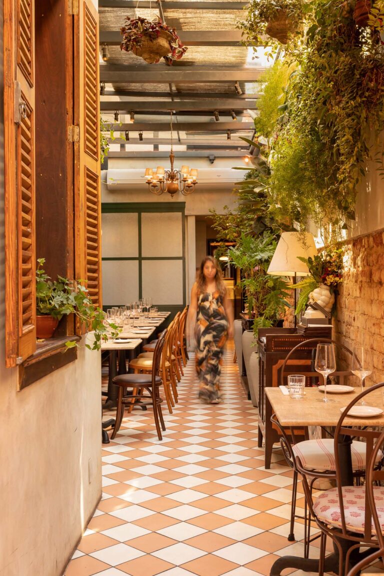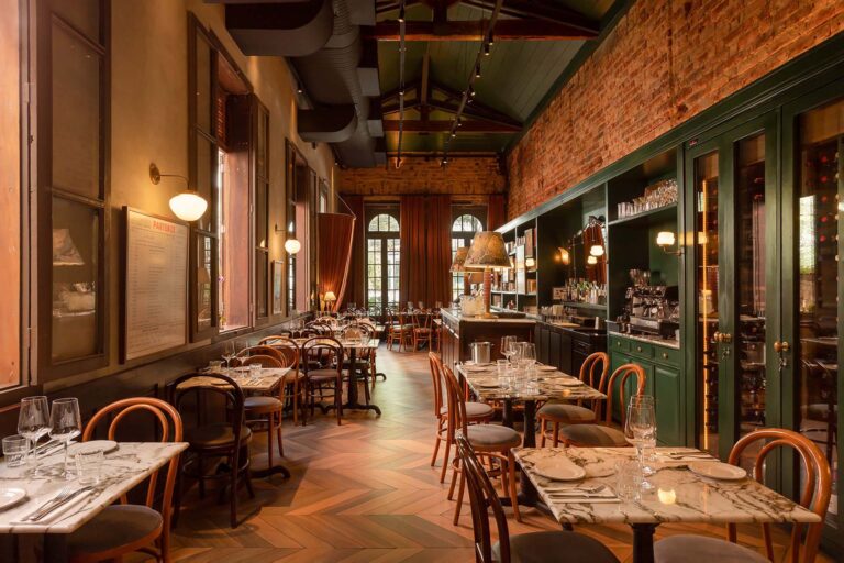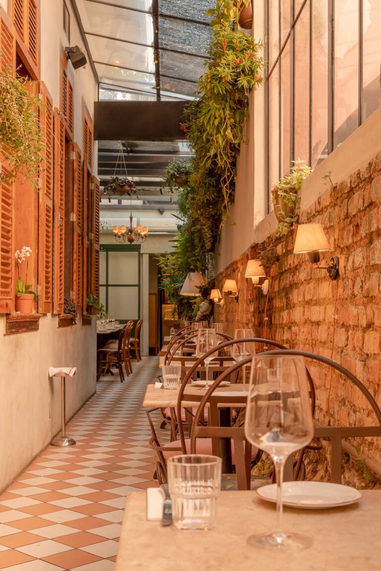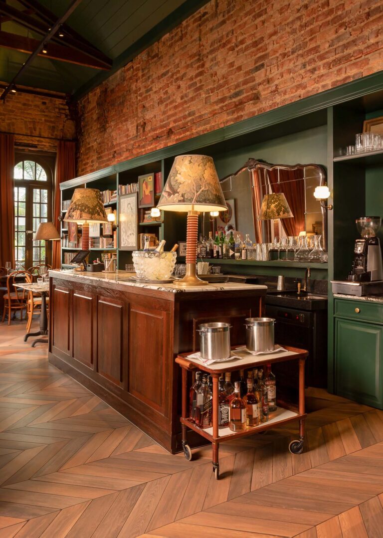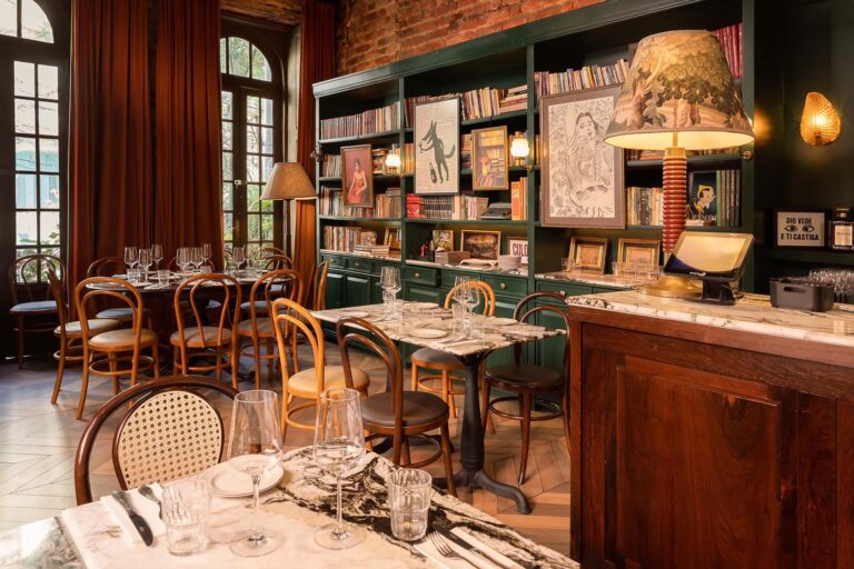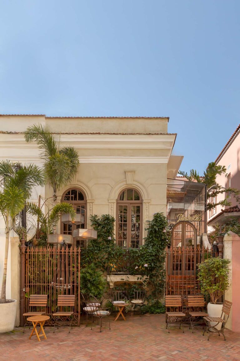 Em um casarão centenário, o Padella Trattoria une a tradição italiana à arquitetura histórica carioca. A reforma valorizou a estrutura do imóvel, revelando os originais tijolinhos aparentes e o telhado em tesoura de madeira. O partido arquitetônico focou em criar um refúgio inspirado nas antigas casas da Itália.