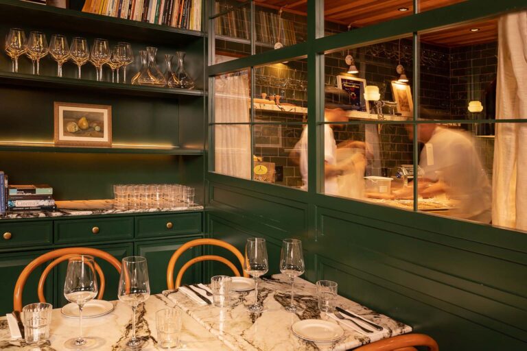 Para expandir o convívio de forma natural, áreas externas cobertas foram criadas ao longo da lateral e nos fundos do terreno. No salão principal, um bar aberto, desenhado para que os clientes acompanhem de perto o preparo das massas e a montagem dos pratos.