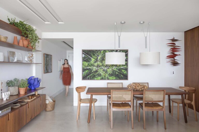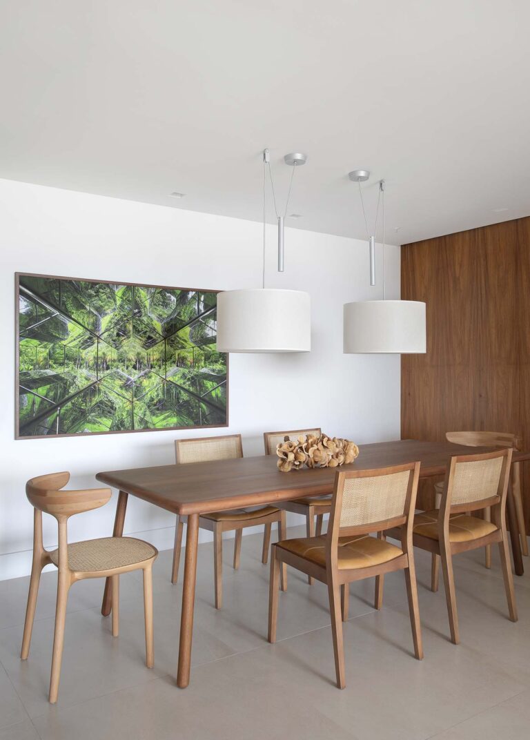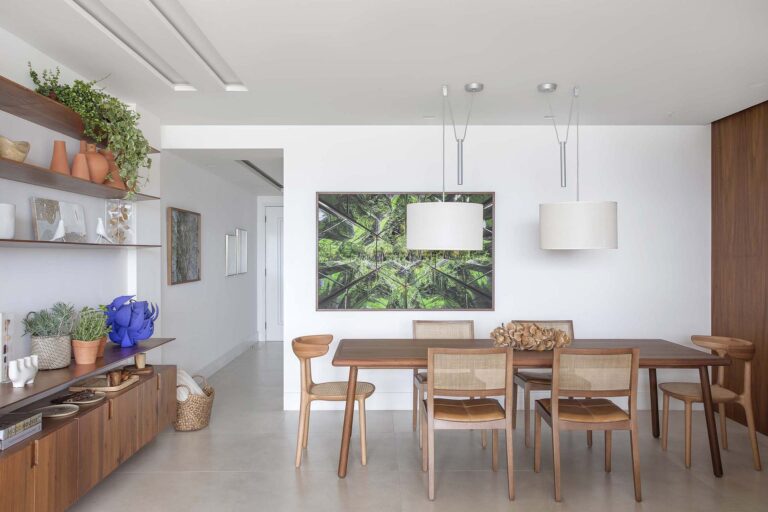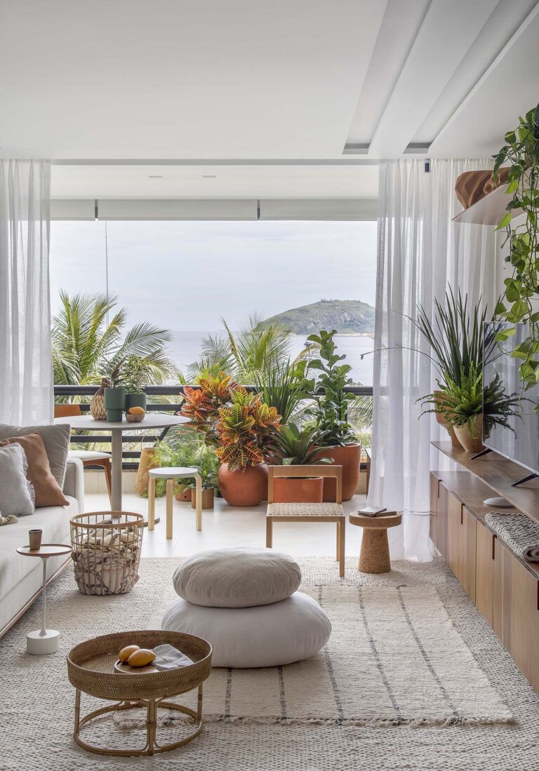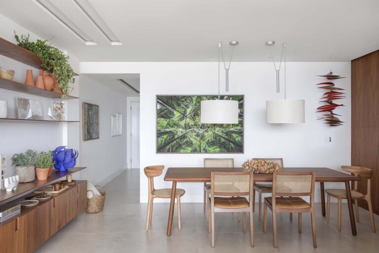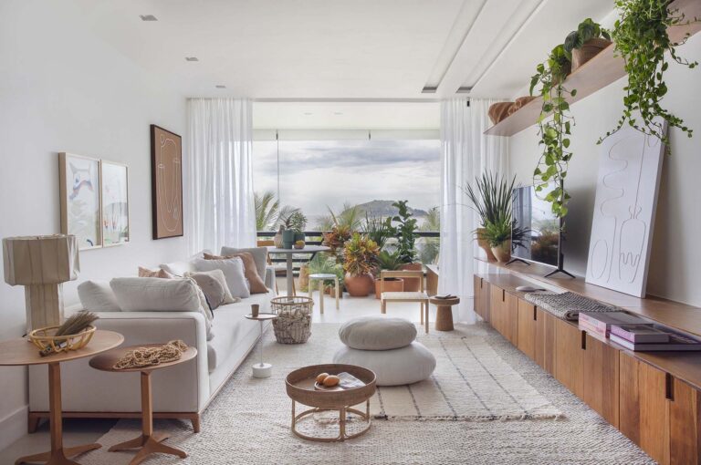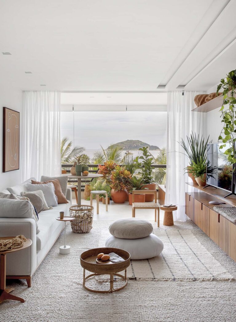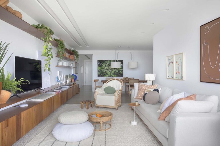 A planta foi repensada para potencializar a sensação de casa, com a integração total das varandas com a área social e com a suíte master, o que ampliou os horizontes e trouxe o verde para dentro do convívio. O mobiliário de design assinado, com destaque para as peças de Jader Almeida e Aristeu Pires, conversa com tapetes de fibra, linho e palha.