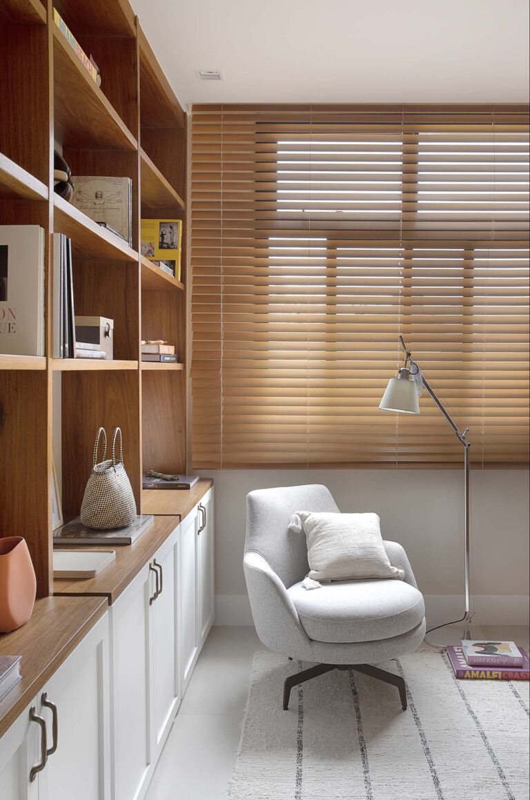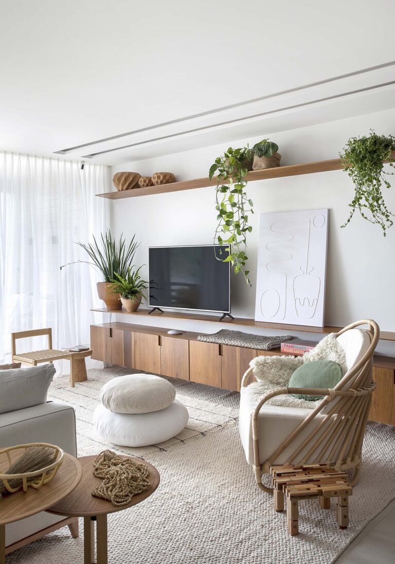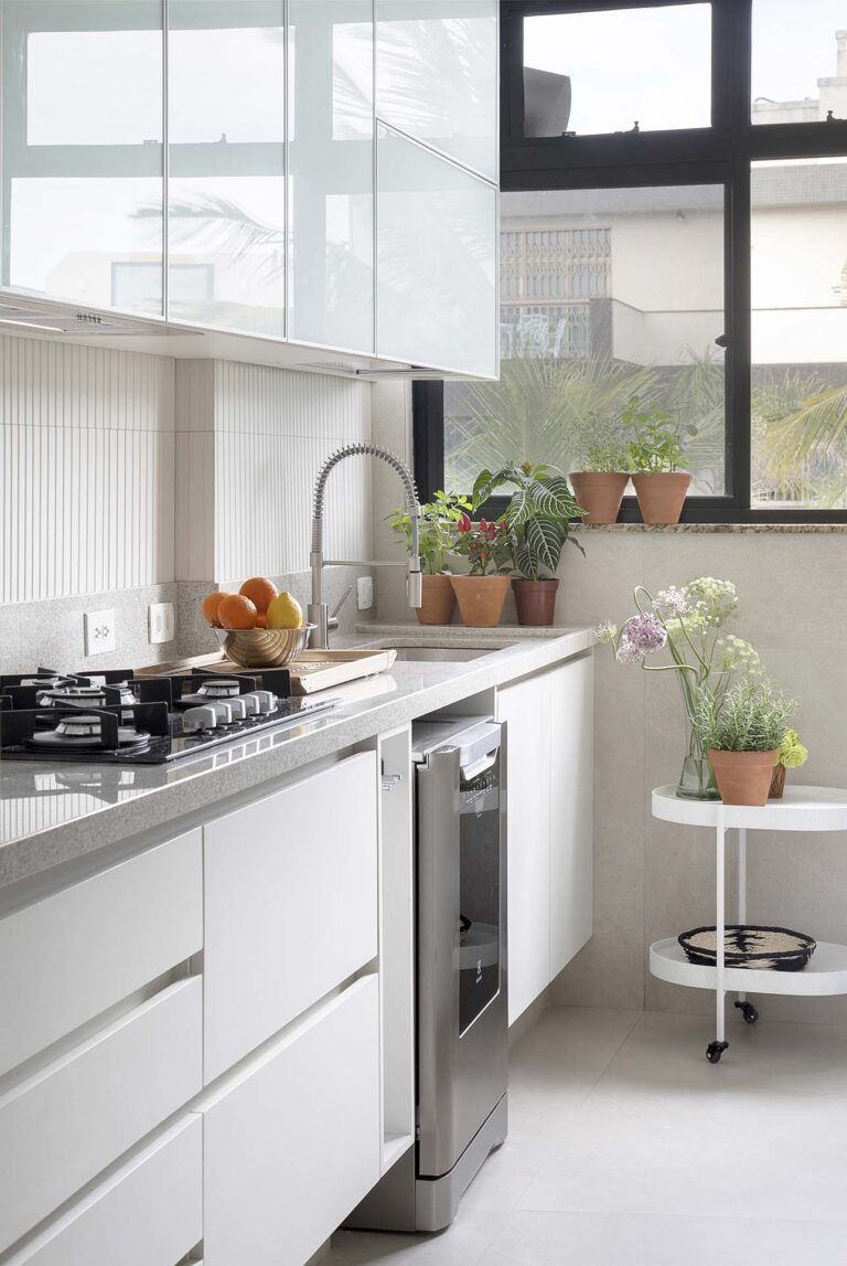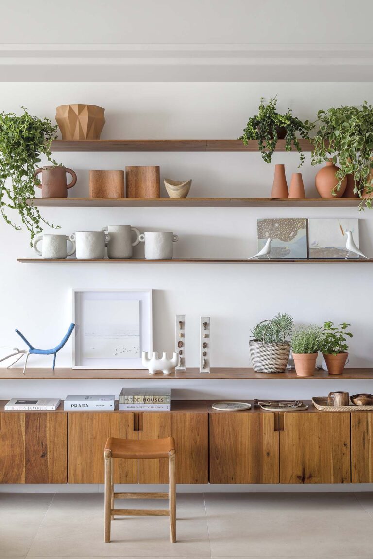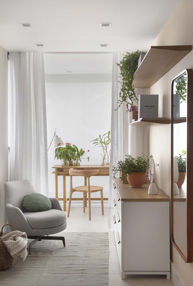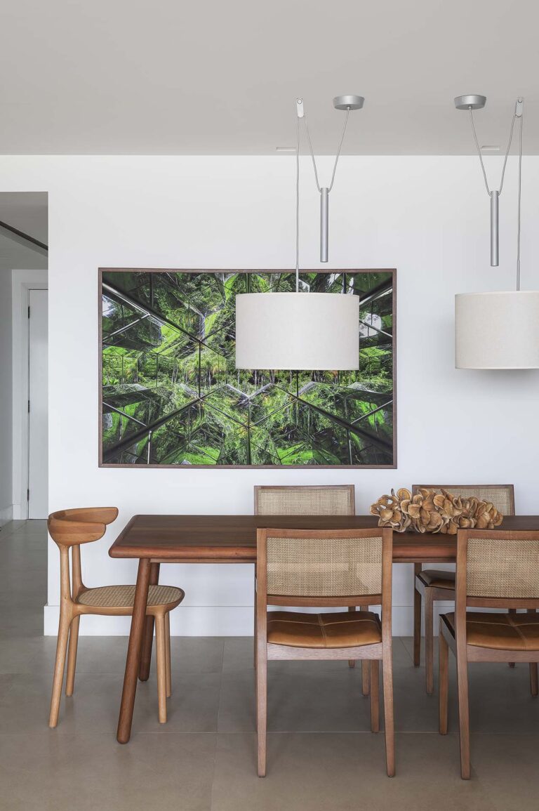 A planta foi repensada para potencializar a sensação de casa, com a integração total das varandas com a área social e com a suíte master, o que ampliou os horizontes e trouxe o verde para dentro do convívio. O mobiliário de design assinado, com destaque para as peças de Jader Almeida e Aristeu Pires, conversa com tapetes de fibra, linho e palha.