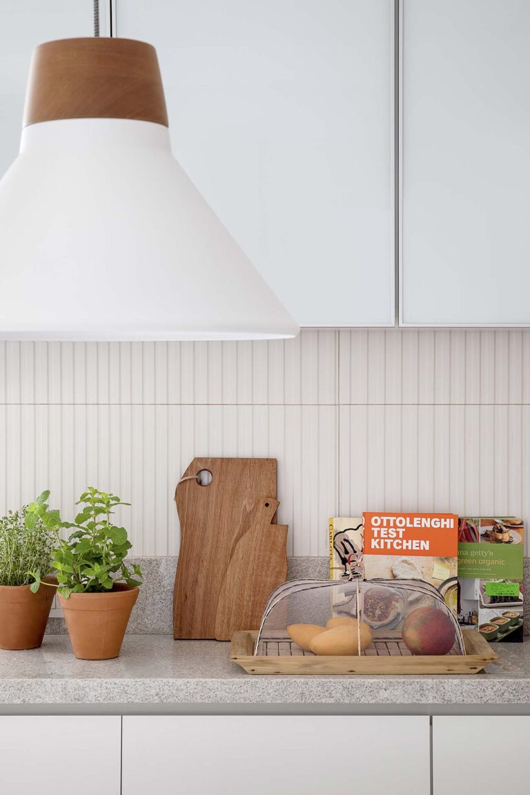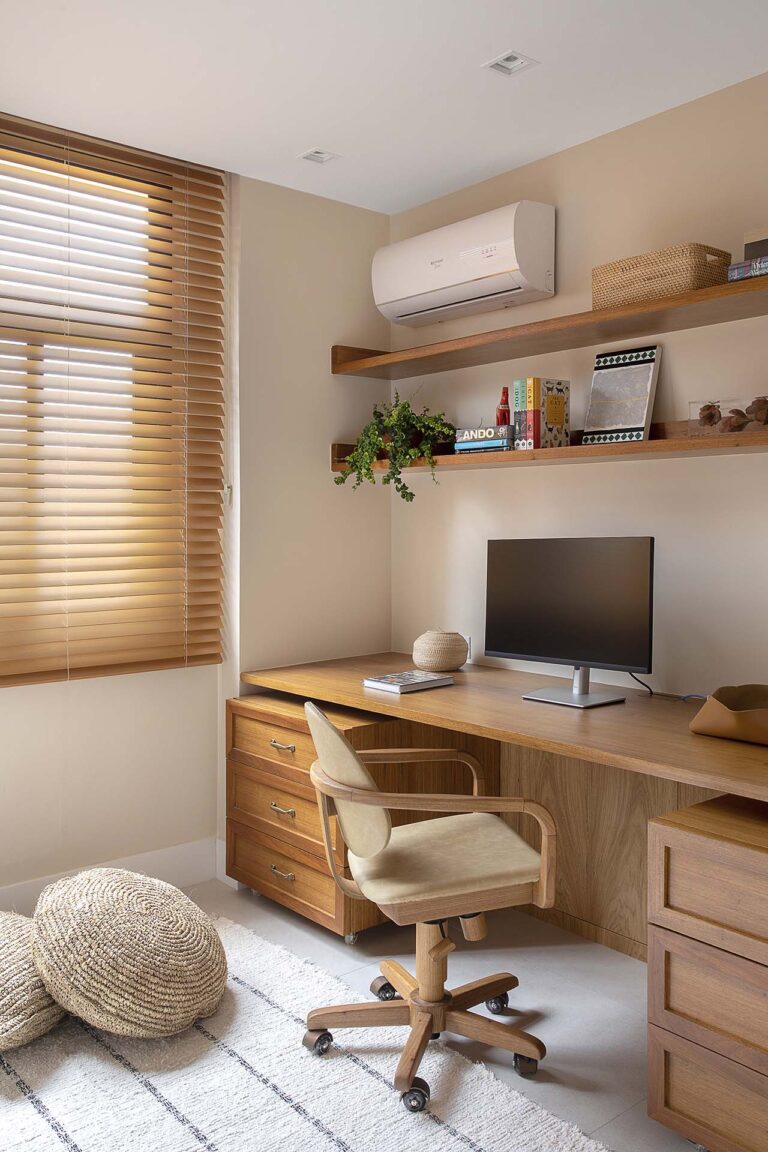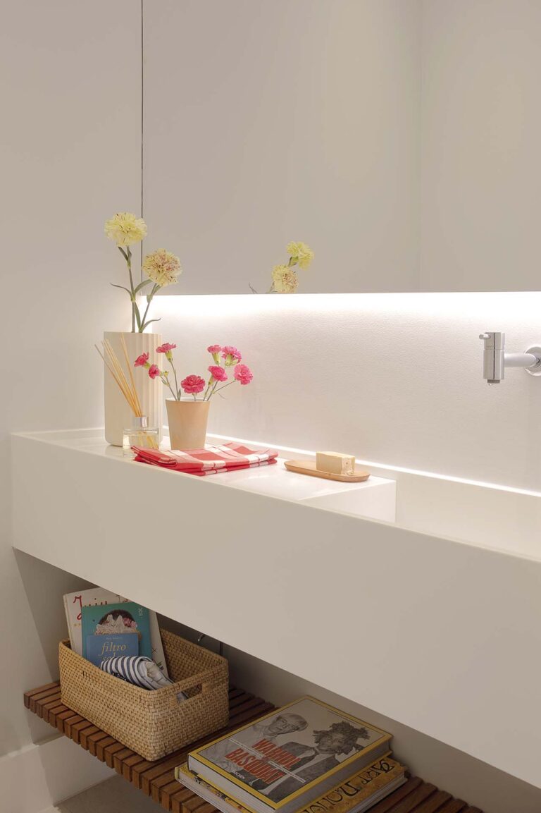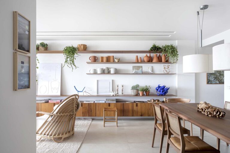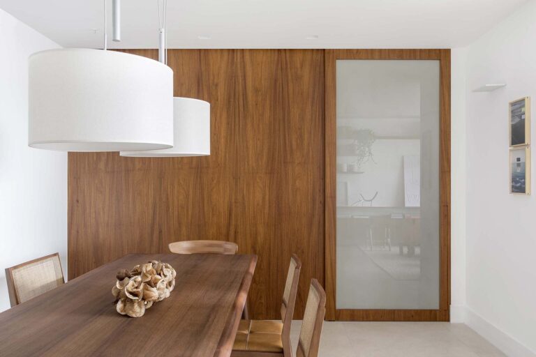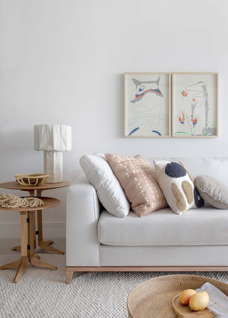 A planta foi repensada para potencializar a sensação de casa, com a integração total das varandas com a área social e com a suíte master, o que ampliou os horizontes e trouxe o verde para dentro do convívio. O mobiliário de design assinado, com destaque para as peças de Jader Almeida e Aristeu Pires, conversa com tapetes de fibra, linho e palha.